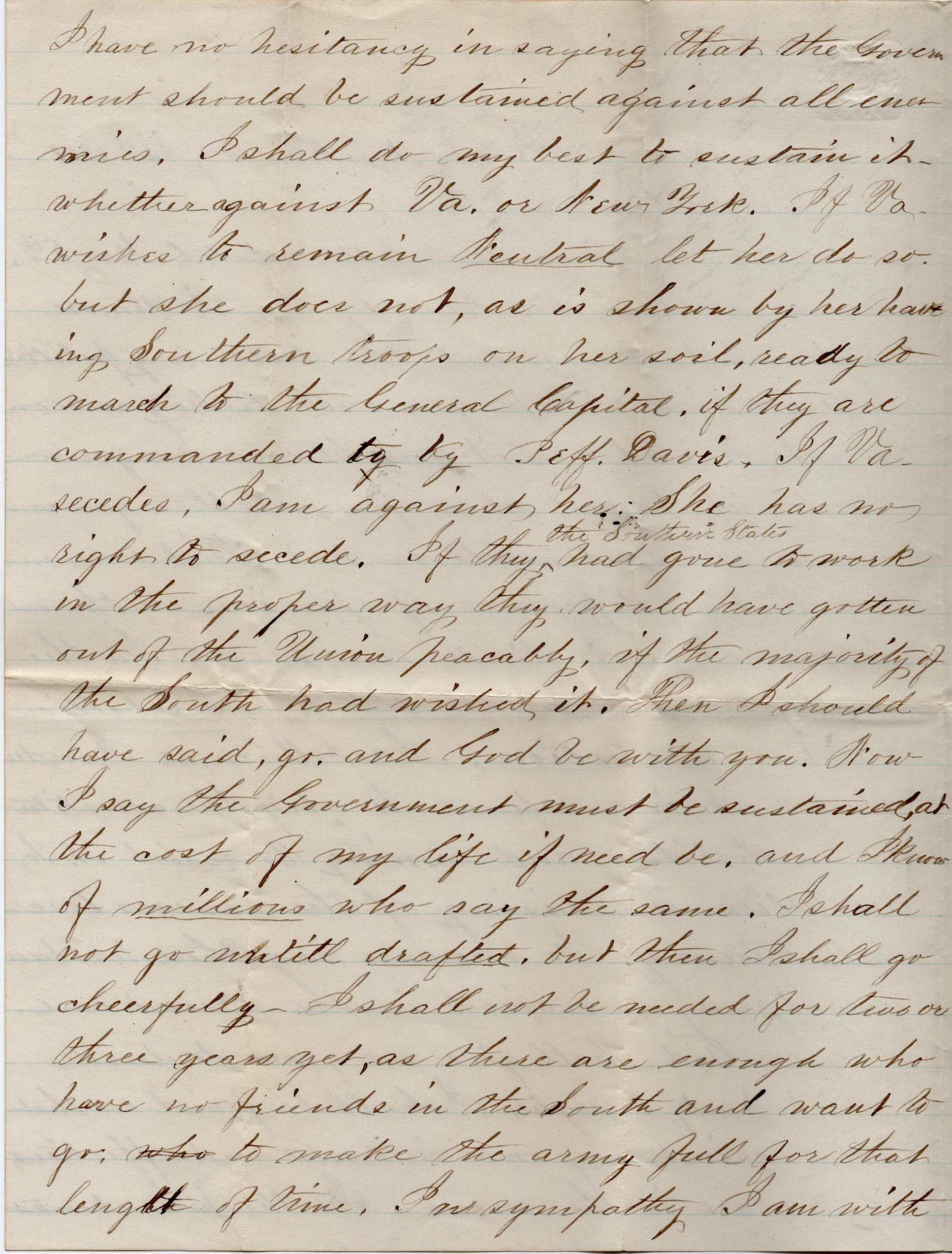 In the present contest, I have no hesitancy in saying that the Government should be sustained against all enemies. I shall do my best to sustain it, whether against Virginia or New York. In Virginia wishes to remain neutral, let her do so. But she does not, as is shown by her having Southern troops on her soil ready to march to the General Capitol, if they are commanded to by Jeff Davis. If Virginia secedes, I am against her. She has no right to secede. If they—the Southern States—had gone to work in the proper way, they would have gotten out of the Union peaceably, if the majority of the South had wished it. Then I should have said, “Go, and God be with you.” Now I say the Government must be sustained at the cost of my life, if need be, and I know of millions who say the same.