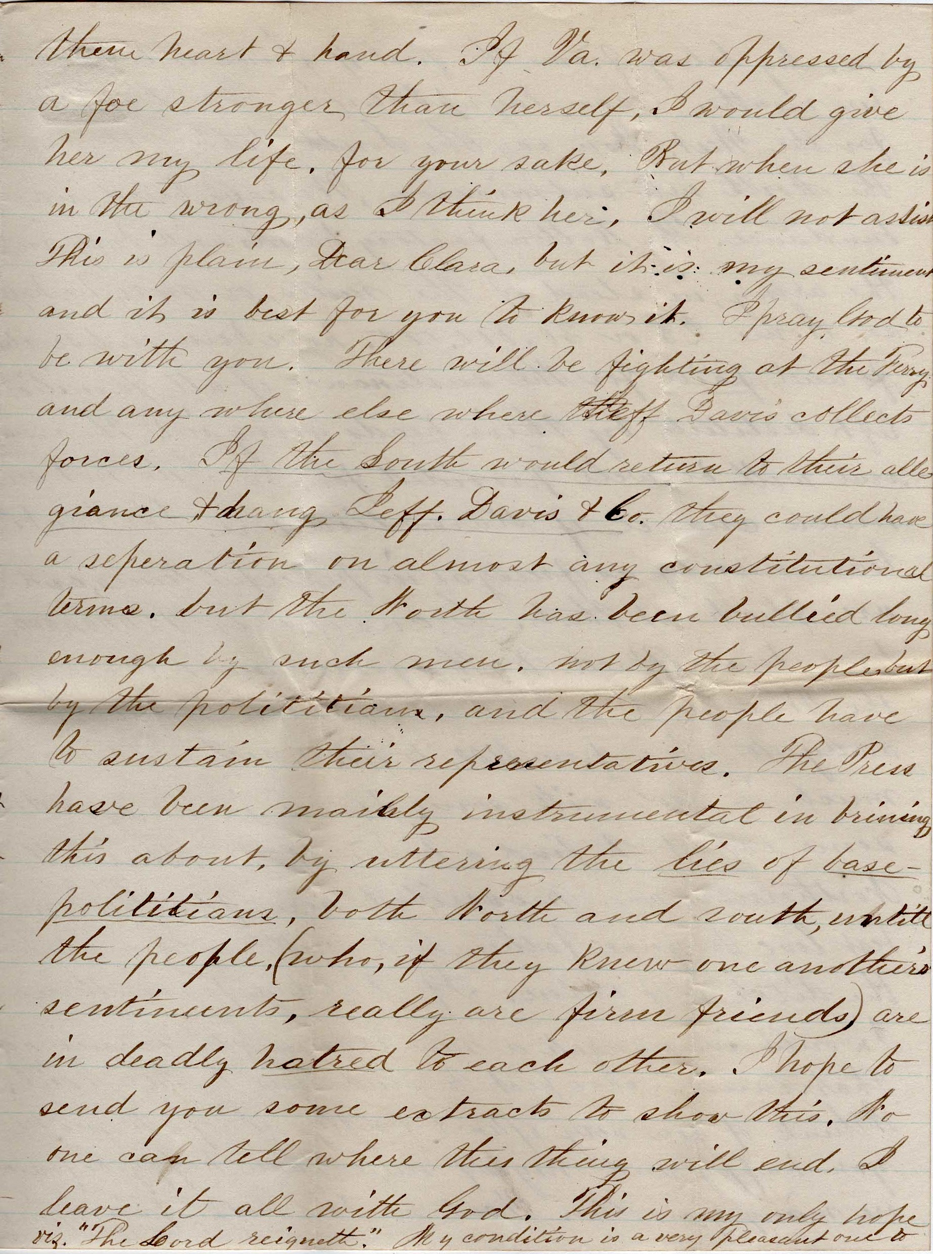 There will be fighting at the Ferry, and anywhere else where Jeff Davis collects forces. If the South would return to their allegiance & hang Jeff Davis & Co., they could have a separation on almost any constitutional terms. But the North has been bullied long enough by such men—not by the people, but the politicians—and the people have to sustain their representatives. The Press have been mainly instrumental in bringing this about, by uttering the lies of base politicians, both North and South, until the people (who, if they knew one another’s sentiments, really are firm friends) are in deadly hatred to each other. I hope to send you some extracts to show this.