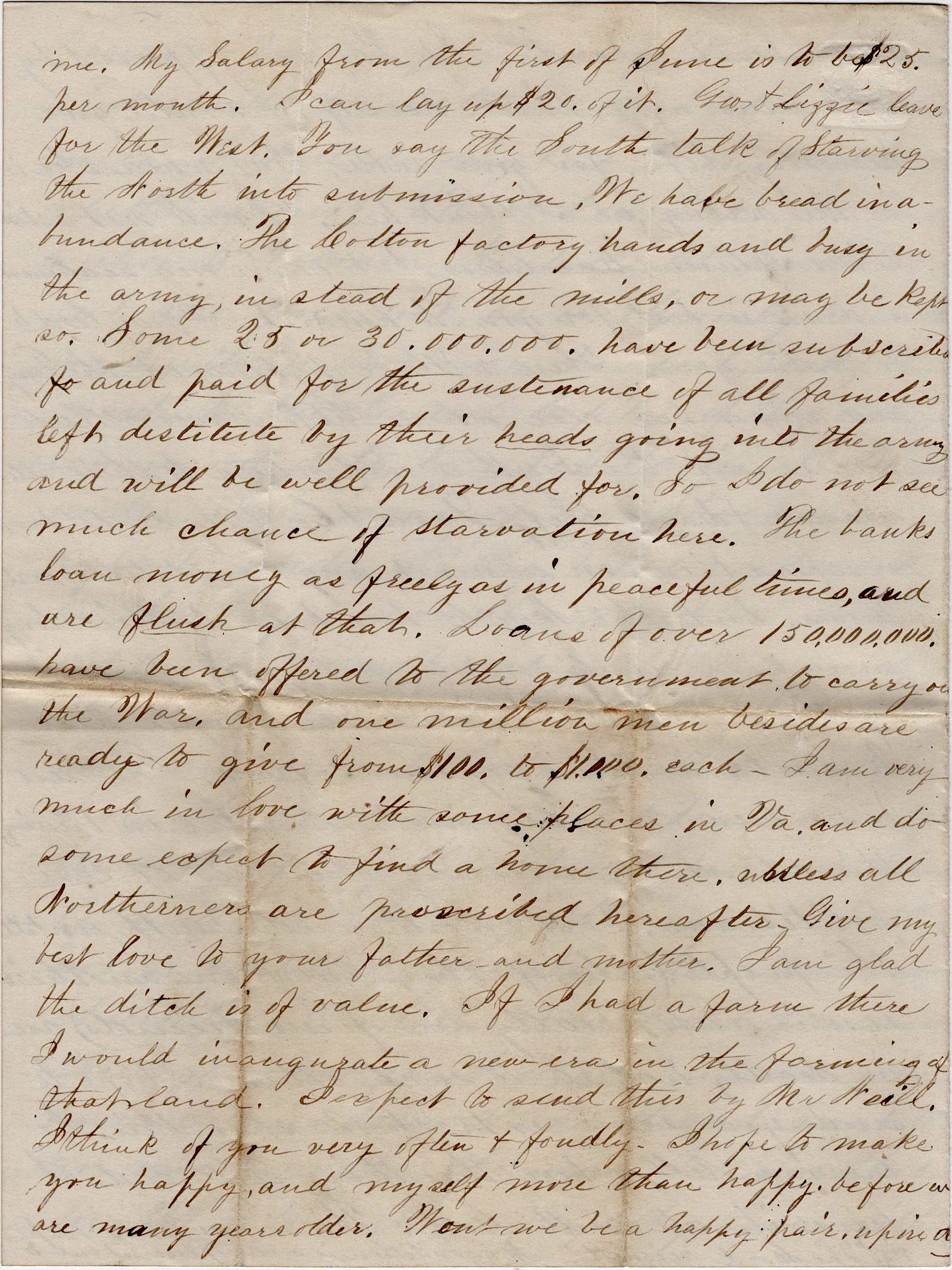 My condition is a very pleasant one to me. My salary from the first of June is to be $25 per month. I can lay up $20 of it. George & Lizzie leave for the West. You say the South talk of starving the North into submission. We have bread in abundance. The Cotton factory hands are busy in the army instead of the mills, or may be kept so. Some 25 or 30,000,000 have been subscribed and paid for the sustenance of all families left destitute by their heads going into the army and will be well provided for. So I do not see much chance of starvation here. The banks loan money as freely as in peaceful times and are flush at that. Loans of over 150,000,000 have been offered to the government to carry on the war, and one million men besides are ready to give from $100 to $1,000 each.