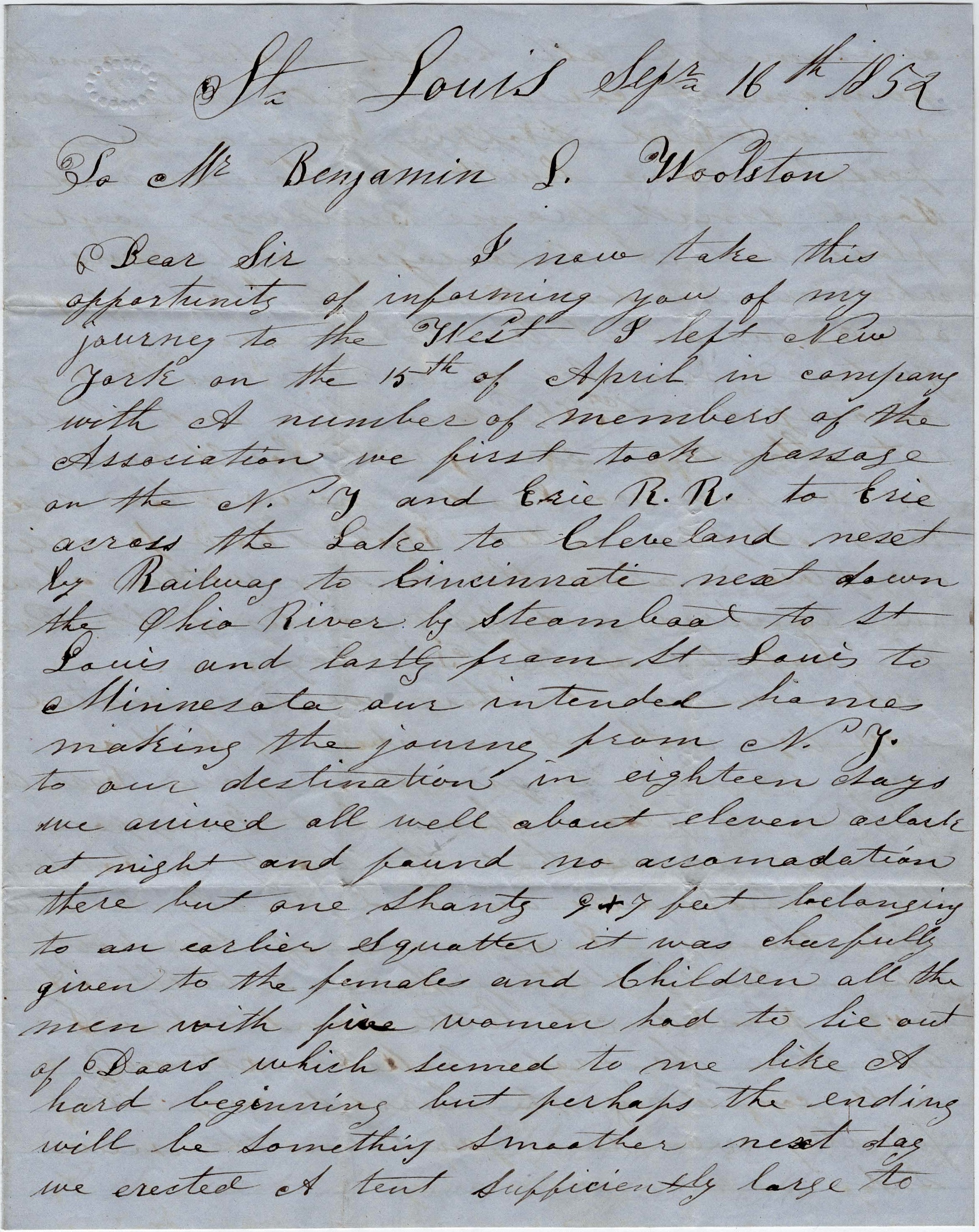 Dear Sir—I now take this opportunity of informing you of my journey to the West. I left New York on the 15th of April in company with a number of members of the Association. we first took passage on the New York and Erie Railroad to Erie, across the Lake to Cleveland. Next by railway to Cincinnati, next down the Ohio river by steamboat to St. Louis, and lastly from St. Louis to Minnesota—our intended homes—making the journey from New York to our destination in eighteen days. We arrived all well about 11 o’clock at night and found no accommodation there but one shanty 9 x 7 feet belonging to an earlier squatter. It was cheerfully given to the females and children. All the men with five women had to lie out of doors which seemed to me like a hard beginning but perhaps the ending will be something smoother.