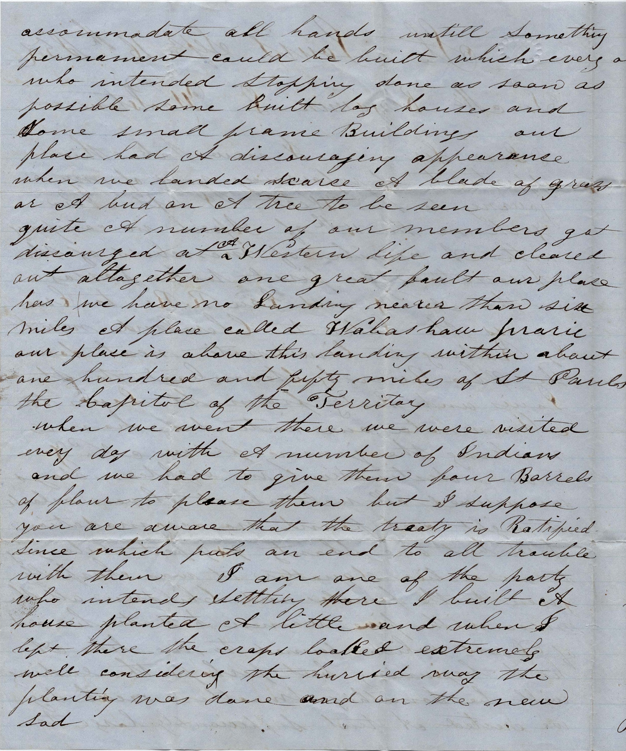 When we went there, we were visited every day with a number of Indians and we had to give them four barrels of flour to please them but I suppose you are aware that the treaty is ratified since which puts an end to all trouble with them. I am one of the party who intends settling there. I built a house, planted a little, and when I left there, the crops looked extremely well considering the hurried way the planting was done and on the new sod.