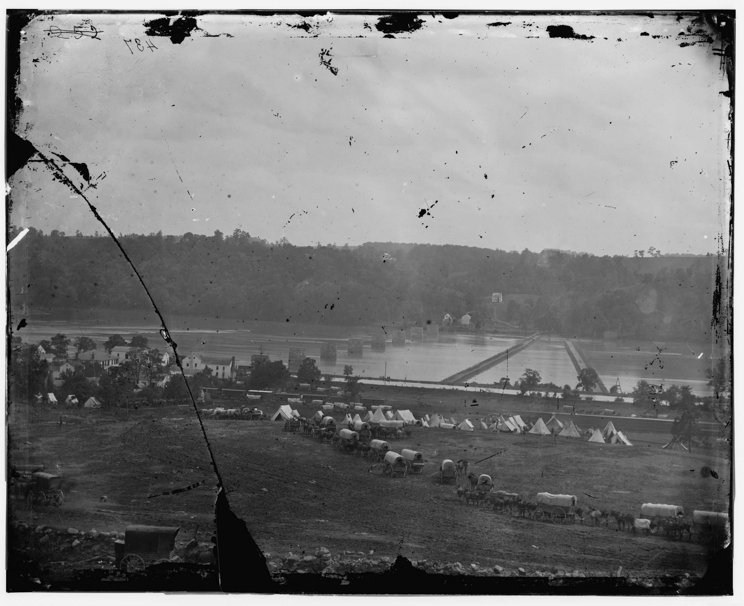 Thus we passed down the river edge between that and the canal by the tow path for about nine miles when Berlin, or Point of Rocks, was reached. Berlin by the way is quite a pretty place, and in the summer time, it seems to me would be a very pleasant town. Way before the rebellion, a bridge spanned the Potomac. It was burned by the Rebels soon after hostilities commenced. In its stead, a pontoon bridge has recently been constructed and over this, the weary soldiers “marched along.” The Brigade finally went into camp about three miles this side of Point of Rocks in “Old Virginia.” There were many disappointed ones in our regiment, particularly among the skedaddlers, and we have quite a number of that class of individuals in this regiment. Their wish was that we might be sent somewhere to do guard duty out of all danger.