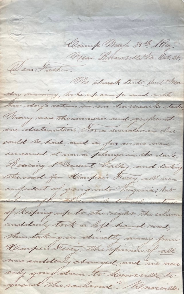We struck tents last Monday [Oct. 27th] morning, broke up camp, and with two days rations in our haversacks started. Many were the surmises and guesses at our destination. For a wonder, no clue could be had, and as far as we were concerned it was a plunge in the dark. LeavingPleasant Valley and taking the road for Harper’s Ferry, all were confident of going into Virginia. But when after three miles travel, instead of keeping up to the right, the column suddenly took a left hand roadm thus taking us directly away from Harper’s Ferry. The opinion of all was suddenly changed and “we were only going down to Knoxville to guard the railroad.” Knoxville was finally reached and very soon after, when it became evident that the column was not going to stop there, conjecture took another turn, and “we were going to the Relay House to recruit.”
