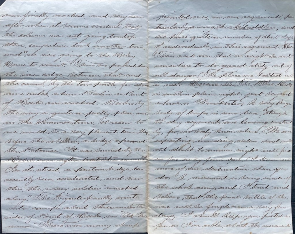 The place we halted at is near Loversville [Lovettsville]. The Blue Ridge is within plain sight just beyond which is Winchester. A very large body of troops is now here thought today regiments are leaving instantly for nobody knows where. We are expecting marching orders and without doubt tomorrow night will find us far away from here. I know no more of our destination than you do. A movement is being made of the whole army, and I trust and believe that the final battle of the war will be fought in a very few days. I shall keep you posted as far as I’m able about the movement of this portion of the army. You will have to trust the papers for the rest.
