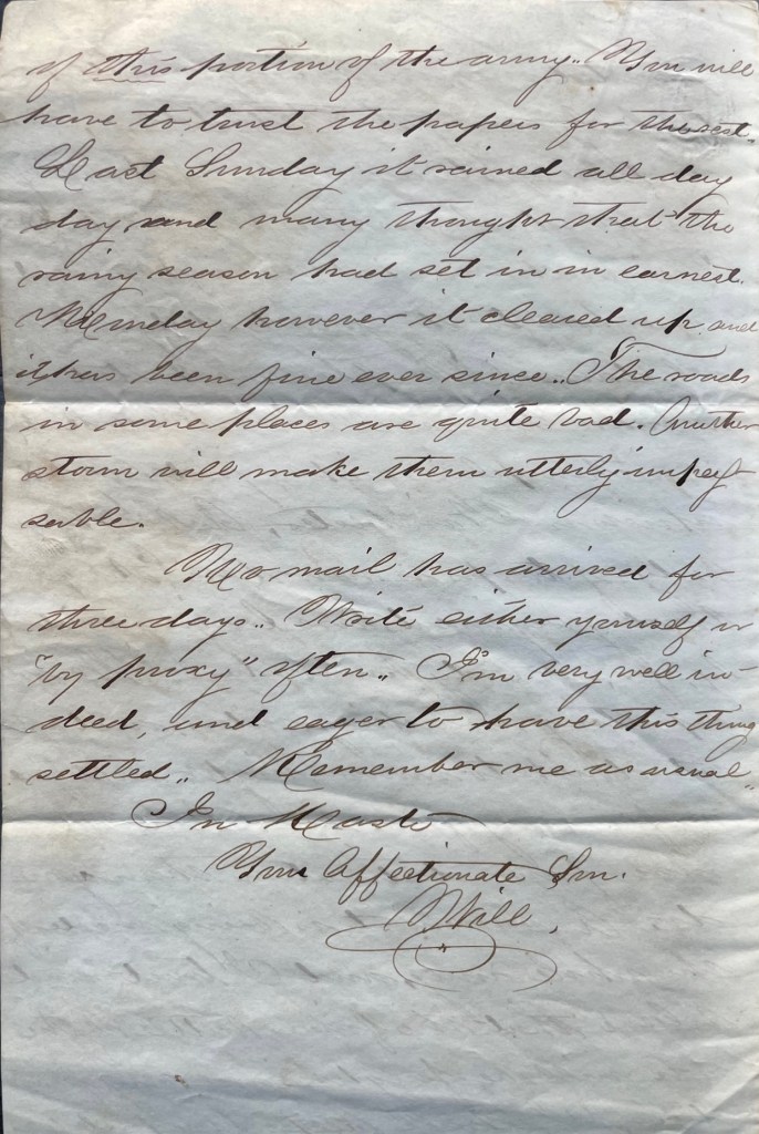 No mail has arrived for three days. Write either yourself or “by proxy” often. I’m very well indeed and eager to have this thing settled. Remember me as usual. In haste, your affectionate son, — Will