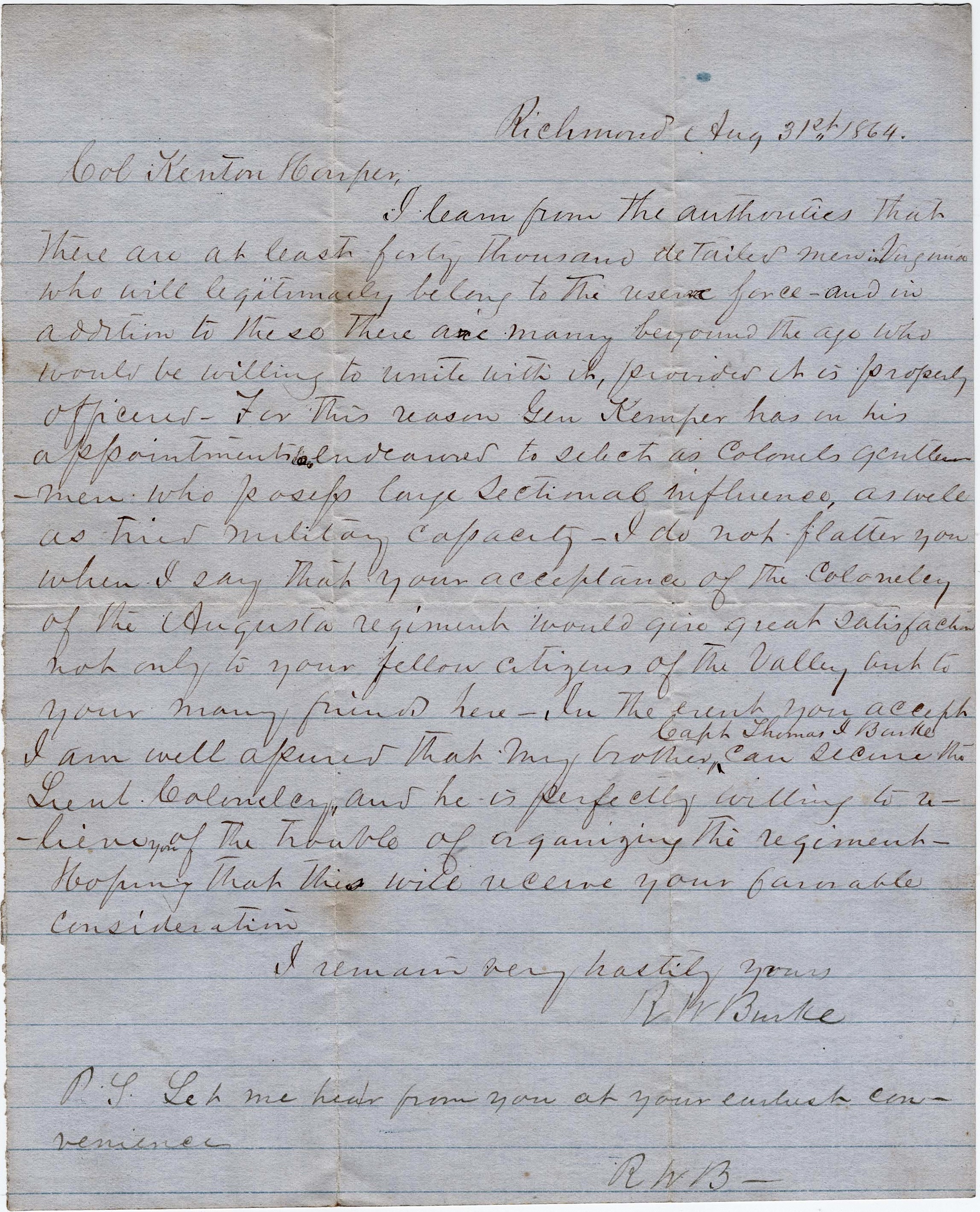 This letter by Robert William Burke (1835-1914) clearly illustrates the interplay between military operations during the Civil War and the pursuit of personal advancement. By August of 1864, the Shenandoah Valley—known as the breadbasket of the Confederacy—faced a dire threat from Union General Philip Sheridan. Although the Confederate forces under General Jubal Early had previously managed to maintain their position, they were now faltering under Sheridan’s relentless military strategies and total war tactics. In an effort to bolster Early’s army, Robert W. Burke highlights a plan by General James Kemper, commander of the Virginia Reserves, to dispatch a contingent of reserves to join forces with Early. Burke suggests that 63 year-old Harper of Augusta county, Virginia, who once led the 5th Virginia Regiment under Gen. Jackson at First Bull Run, and who retired in September 1861, lead the contingent. Burke also suggests that his older brother, Captain Thomas J. Burke (1833-1899) of the 5th Virginia, serve as Harper’s second-in-command. Such an elevation would have been questionable, given that Captain Burke had been reported as “Wounded leg, permanently disabled” following the 1862 Battle of Gaines’ Mill. Ultimately, Burke’s proposal yielded no results. Harper never took command of such a force, the Valley was decisively lost for the Confederacy after the Battle of Cedar Creek in October, and Thomas Burke departed from active duty that December.