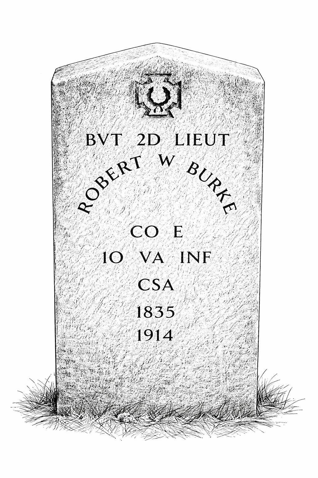 Robert William Burke is buried at the foot of a Confederate soldier’s headstone in Edinburg, Virginia. Engraved on the stone, Burke is identified as a Bvt. 2d Lieutenant who once served in Co. E, 10th Virginia Infantry.