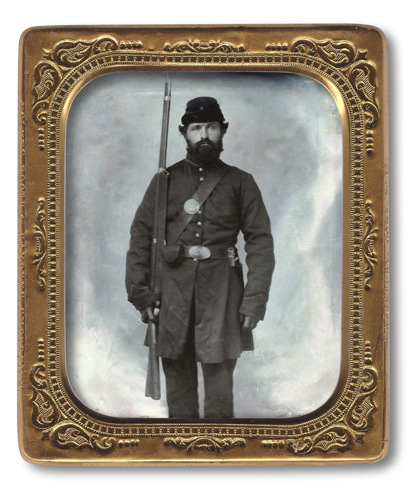 Accompanying the group of letters are four period documents: a pass for Dinsmore and a compatriot; a small, satirical printed, anti-Jefferson Davis cartoon with Dinsmore’s inscription on the back indicating his regimental affiliation and current position “Army of the Potomac in front of Richmond 1862”; a patriotic motif sheet inked by Dinsmore as being sent from Camp Union at Bladensburg, Md. on Oct. 20, 1861; an early 20th century, state of Massachusetts document, perhaps a pension affidavit. Also included in this grouping are two cased images—a 1/6 plate, ruby Ambrotype of Private Dinsmore in uniform, fully accoutered, holding a musket; 1/9 plate daguerreotype of Lizzie Dinsmore.