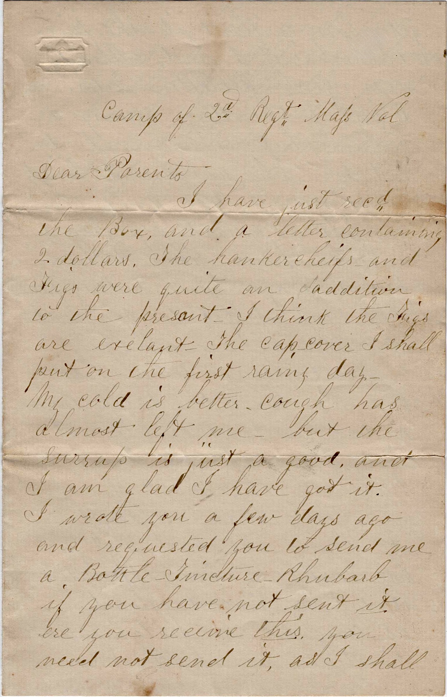 I have just received the box and a letter containing two dollars. The handkerchiefs and figs were quite an addition to the present. I think the figs are excellent. The cap cover I shall put on the first rainy day. My cold is better. Cough has almost left me but the syrup is just as good and I am glad I have got it. I wrote you a few days ago and requested you to send me a bottle of tincture rhubarb. If you have not sent it ere you receive this, you need not send it as I shall get along without it. The piece Father sent I had already seen.