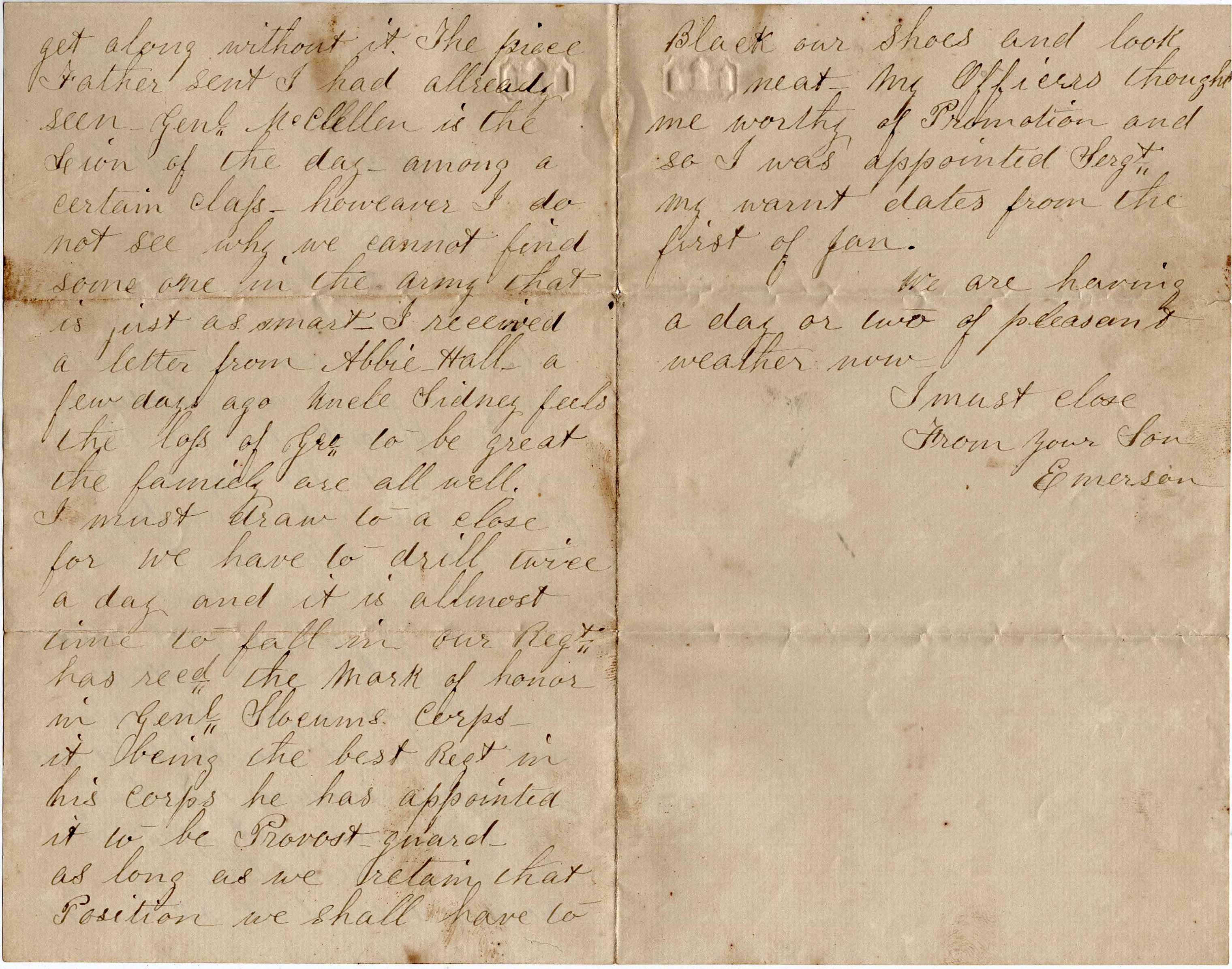 We are having a day or two of pleasant weather now. I must close. From your son, — Emerson