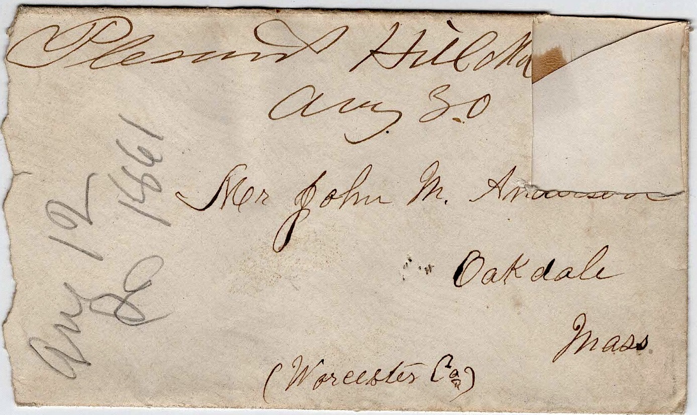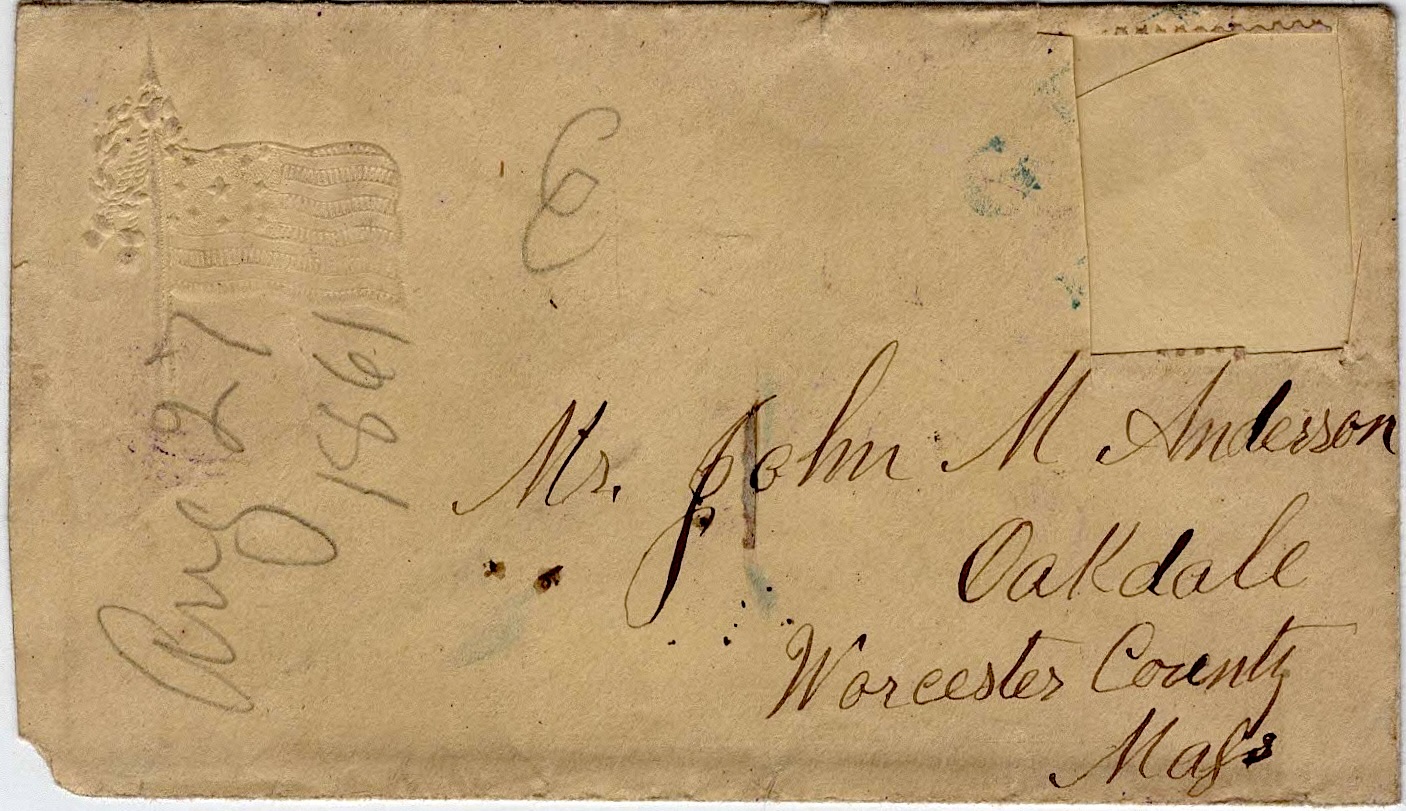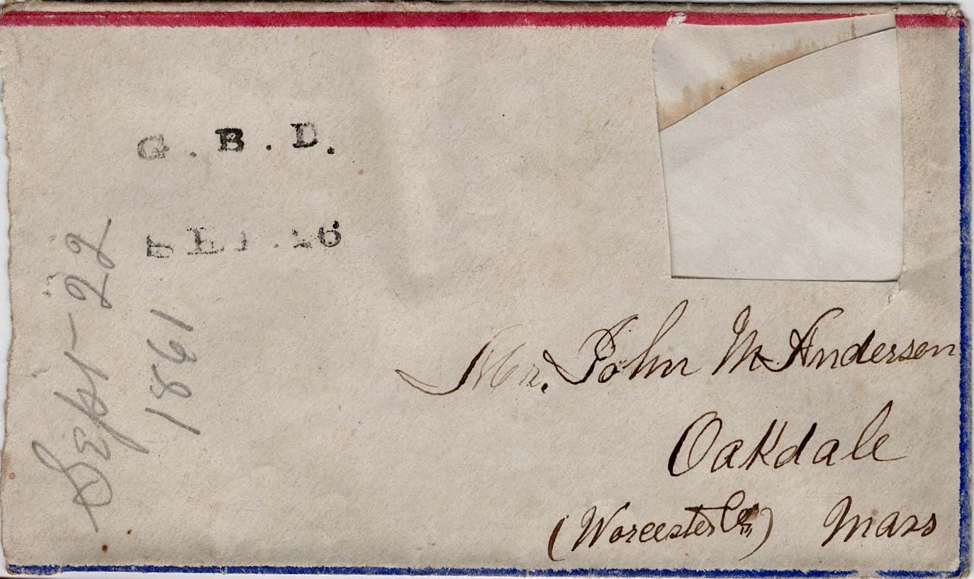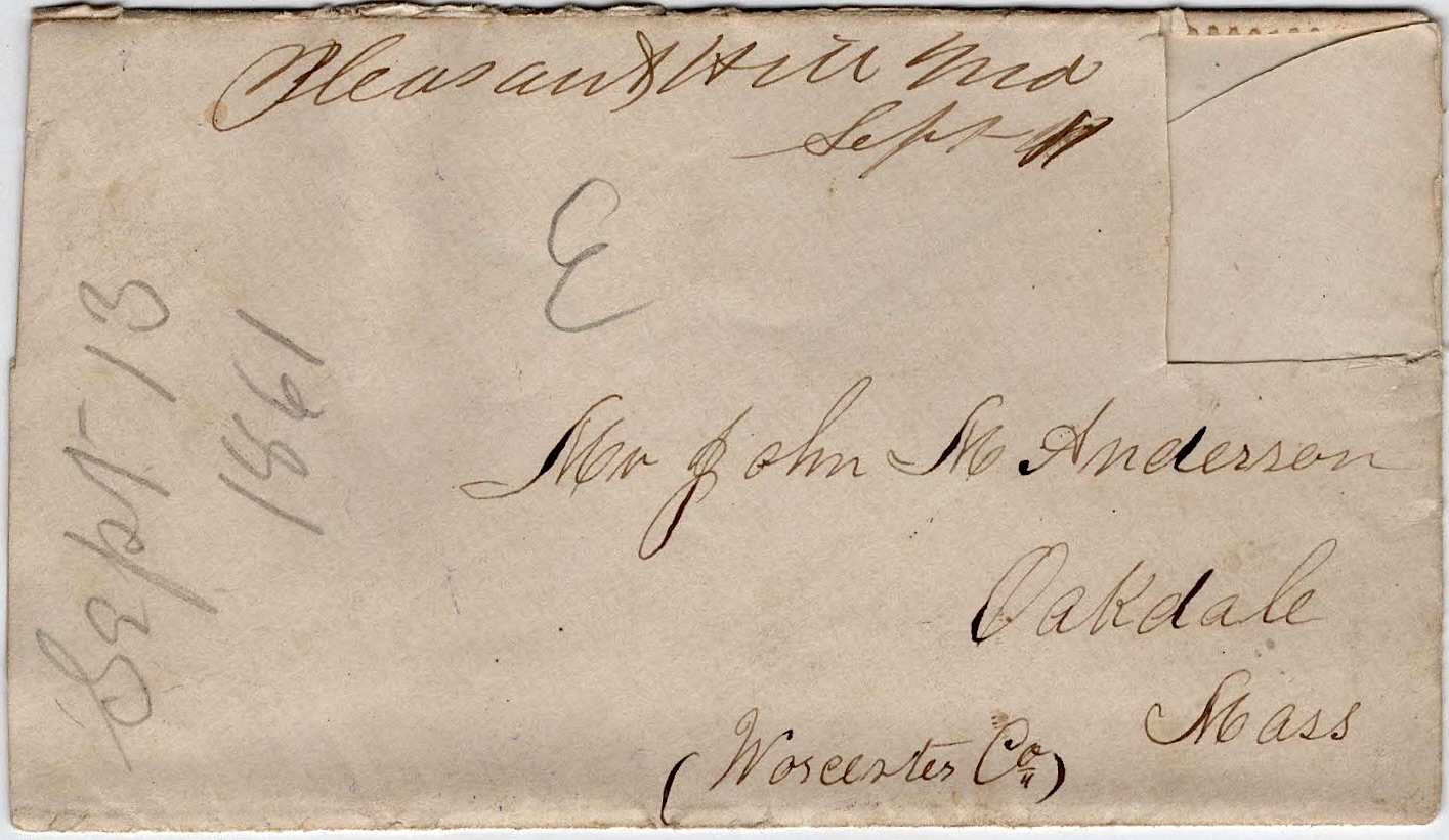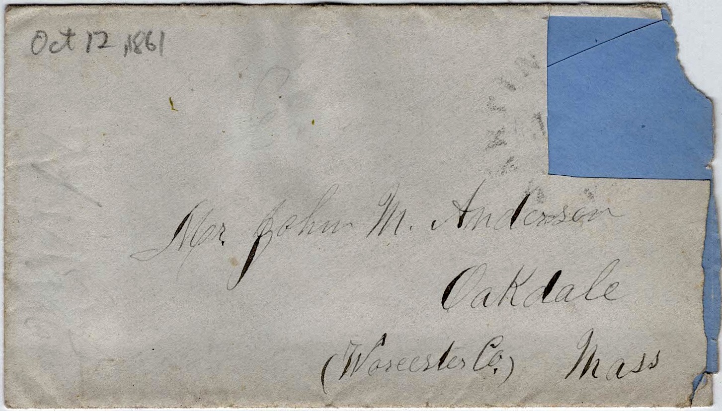 The following letters were written by John “Emerson” Anderson (1833-1896), a boot maker and the son of John May and Parney (Hastings) Anderson of Oakdale, Worcester county, Massachusetts. Emerson enlisted on 25 May 1861 as a private in Co. D, 2nd Massachusetts Infantry. He was taken prisoner on 24 May 1862 during the battle of Winchester but was paroled in June 1862 and promoted to sergeant, mustering out of the regiment in mid-July 1865. The 2nd Mass Vols. participated in the battles of Cedar Mountain, Antietam, Chancellorsville, Gettysburg, Resaca, Kennesaw Mountain, Siege of Atlanta, March to the Sea, Savannah, and others.