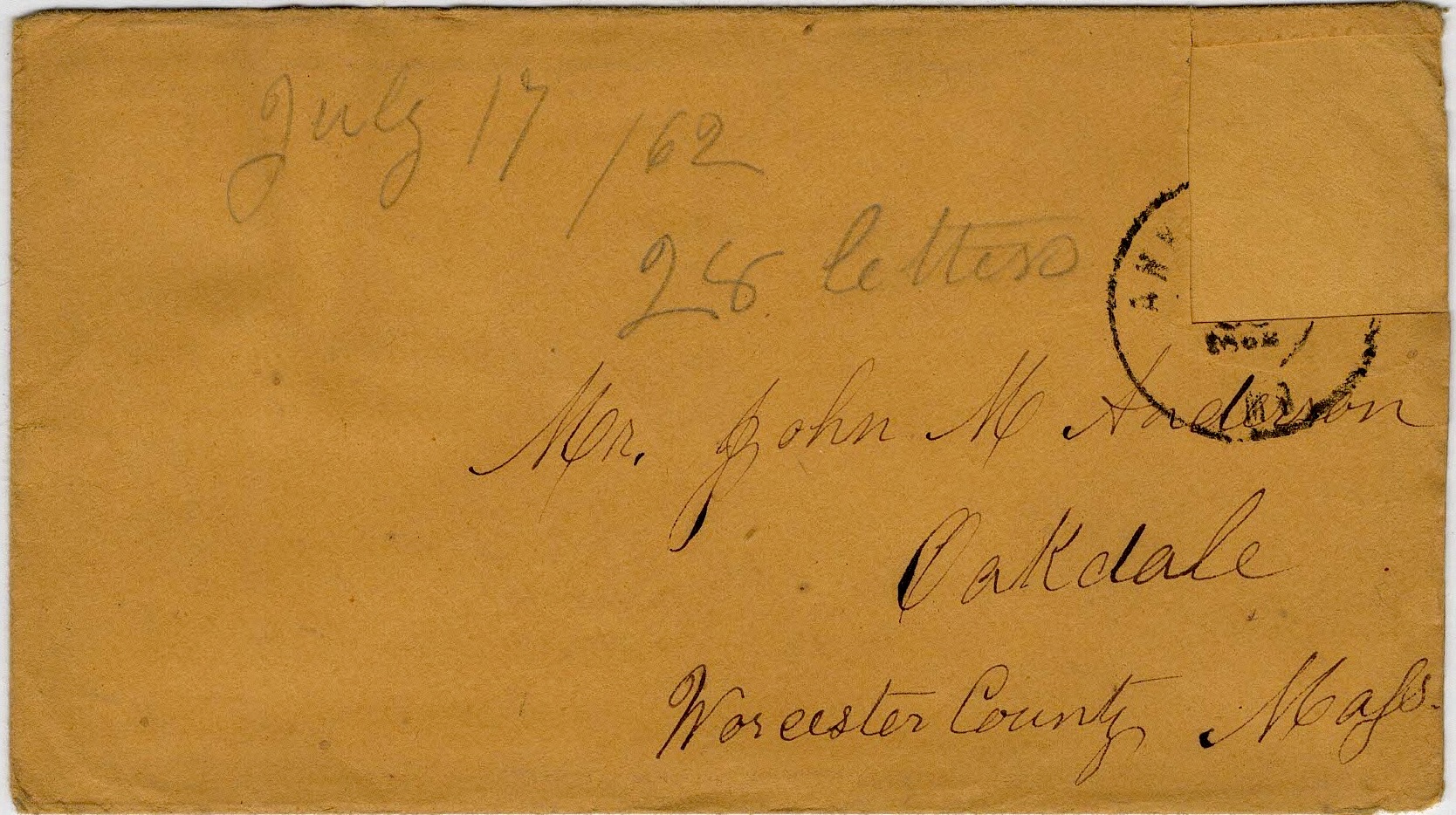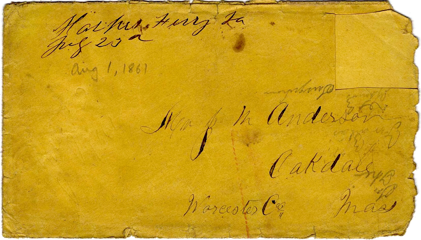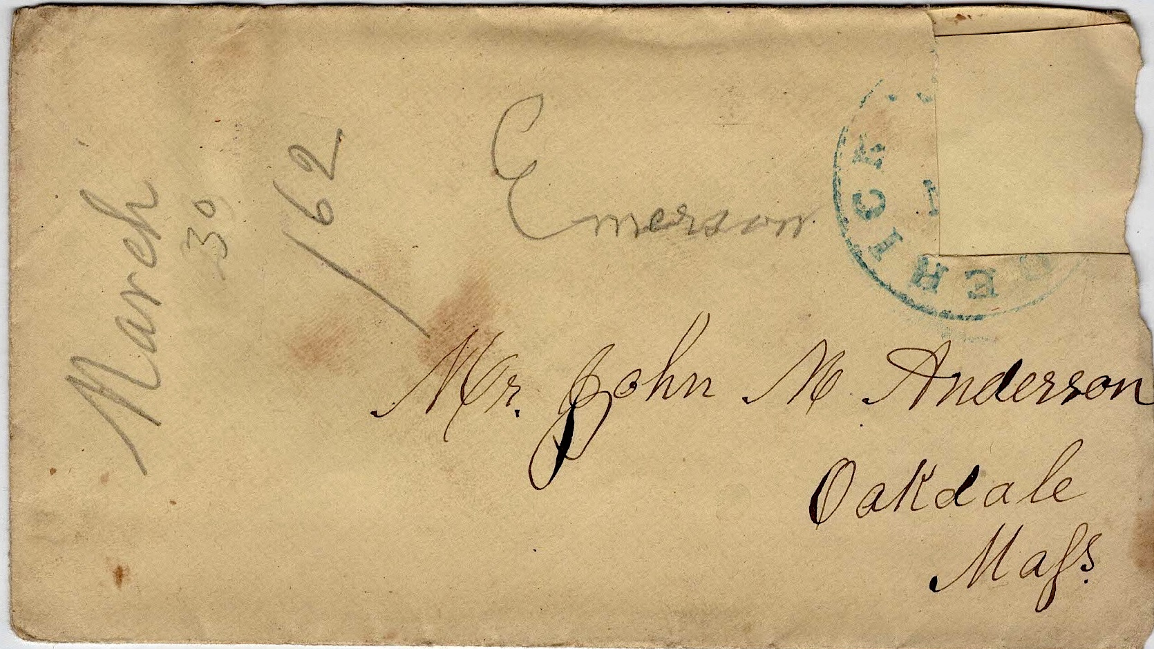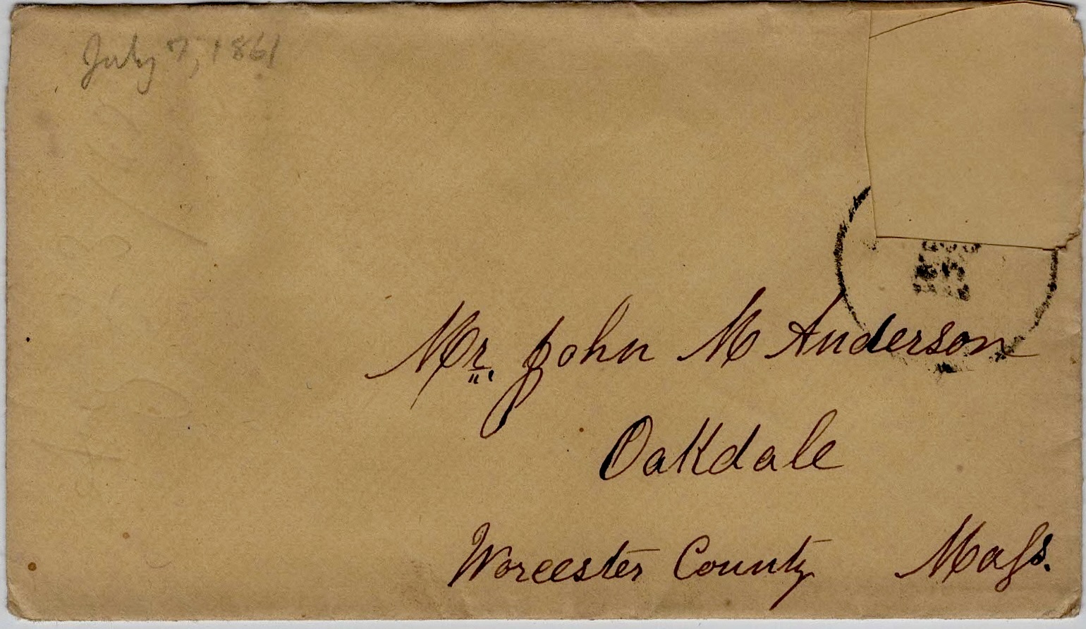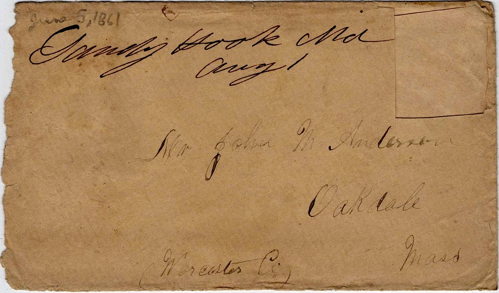 The following letters were written by John “Emerson” Anderson (1833-1896), a boot maker and the son of John May and Parney (Hastings) Anderson of Oakdale, Worcester county, Massachusetts. Emerson enlisted on 25 May 1861 as a private in Co. D, 2nd Massachusetts Infantry. He was taken prisoner on 24 May 1862 during the battle of Winchester but was paroled in June 1862 and promoted to sergeant, mustering out of the regiment in mid-July 1865. The 2nd Mass Vols. participated in the battles of Cedar Mountain, Antietam, Chancellorsville, Gettysburg, Resaca, Kennesaw Mountain, Siege of Atlanta, March to the Sea, Savannah, and others.