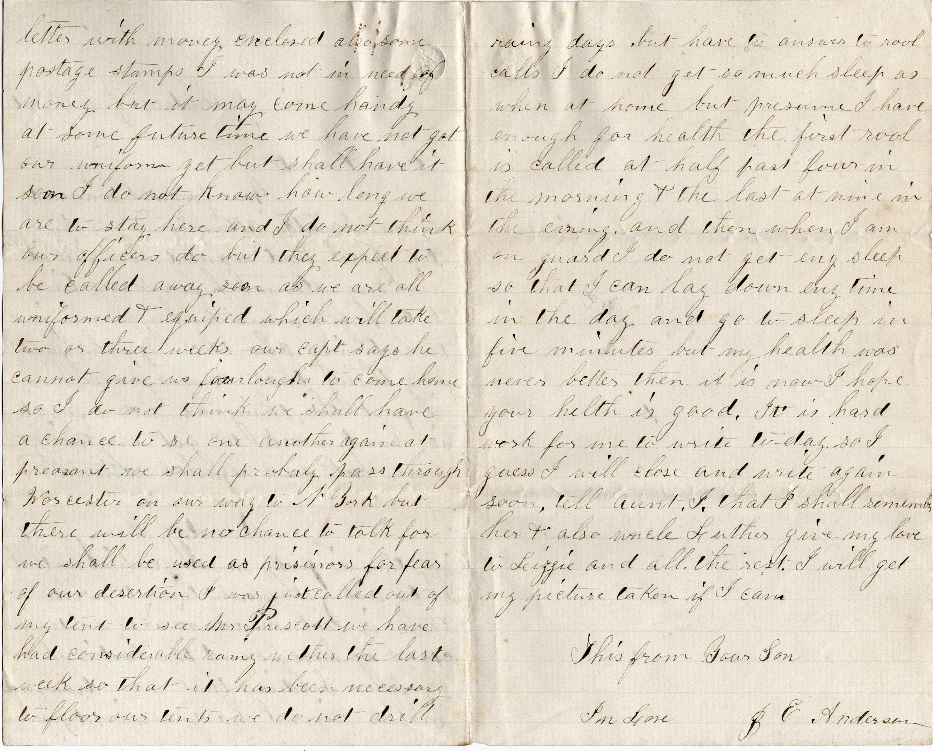I have received your letter with money enclosed. Also some postage stamps. I was not in need of money but it may come handy at some future time. We have not got our uniform yet but shall have it soon. I do not know how long we are to stay here and I do not think our officers do but they expect to be called away soon as we are all uniformed & equipped which will take two or three weeks. Our Capt. says he cannot give us furloughs to come home so I do not think we shall have a chance to see one another again at present. We shall probably pass through Worcester on our way to New York but there will be no chance to talk for we shall be used as prisoners for fear of our desertion.