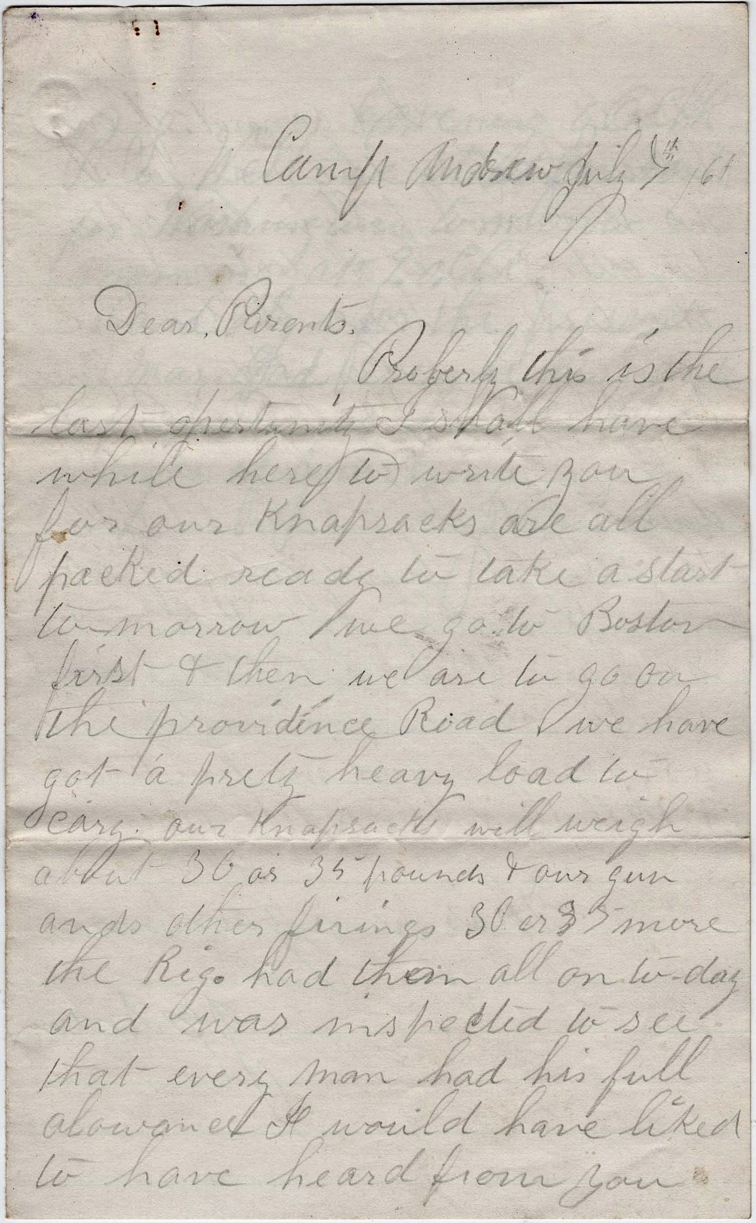 Probably this is the last opportunity I shall have while here to write you for our knapsacks are all packed ready to take a start tomorrow. We got to Boston first and then we are to go on the Providence Road. We have got a pretty heavy load to carry. Our knapsacks will weight about 30 or 35 pounds & our gun and other fixings 30 or 35 more. The regiment had them all on Tuesday and was inspected to see that every man had his full allowance.