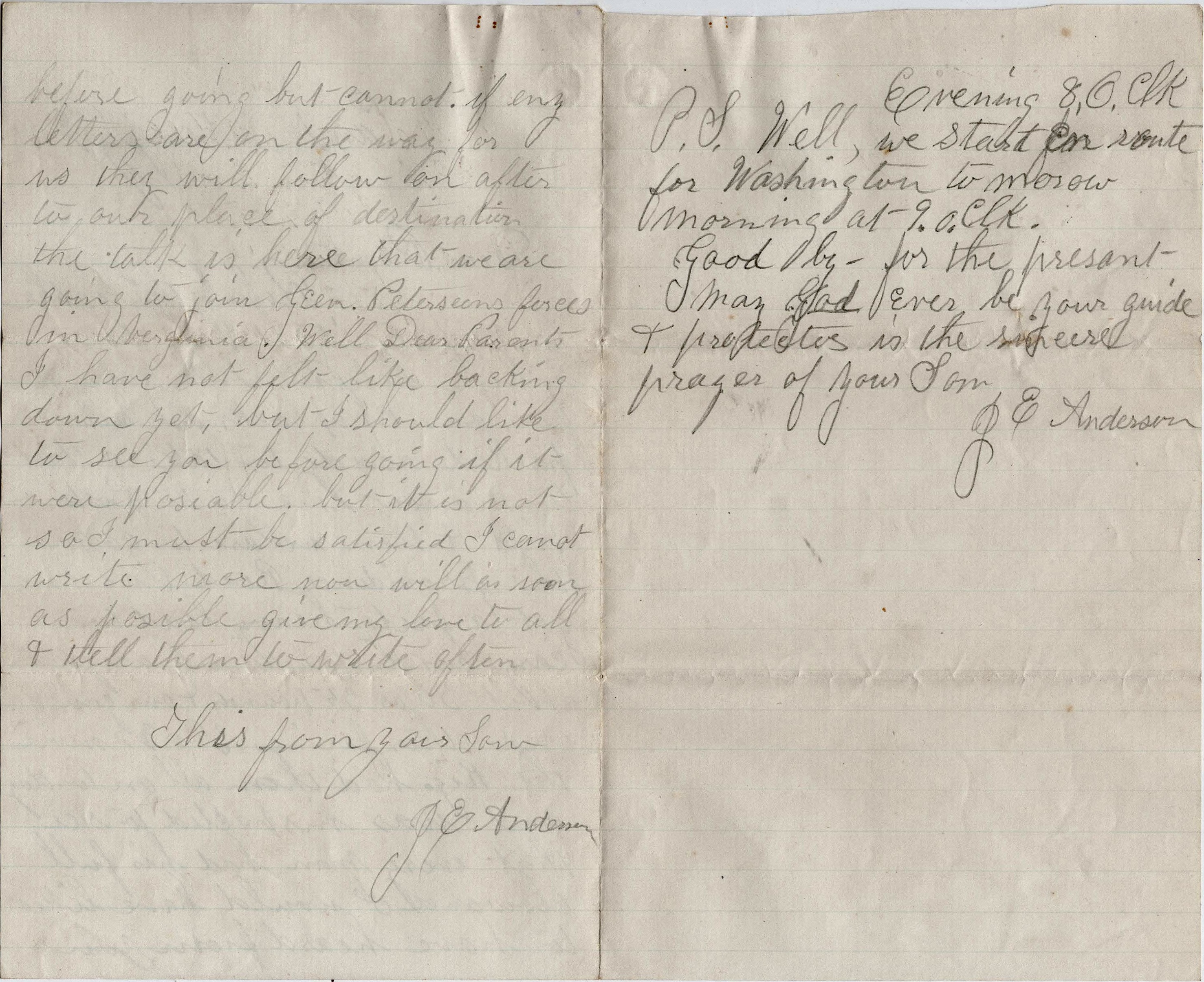 P. S. Evening, 8 o’clock. Well, we start en route for Washington tomorrow morning at 9 o’clock. Goodbye for the present. May God ever be our guide & protector is the sincere prayer of your son. — J. E. Anderson