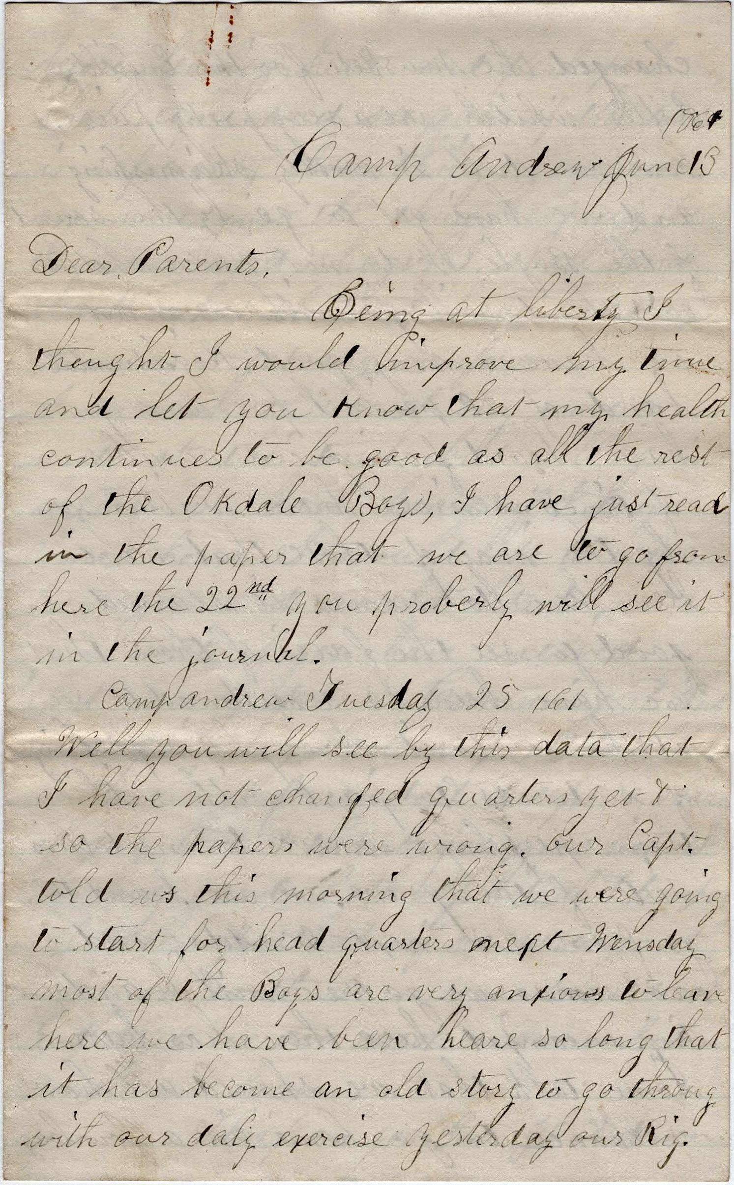 Camp Andrew, Tuesday, [June] 25, 1861. Well, you will see by this date that I have not changed quarters yet & so the papers were wrong. Our Captain told us this morning that we are going to start for headquarters next Monday. Most of the boys are very anxious to leave here. We have been here so long it has become an old story to go through with our daily exercise.