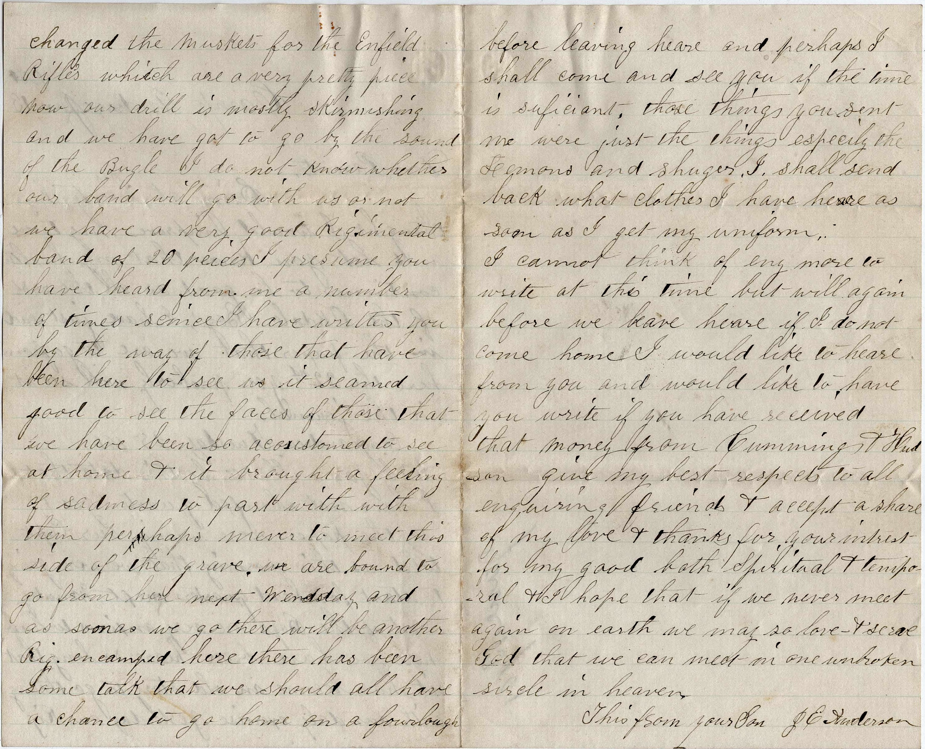 I cannot think of any more to write at this time but will again before we leave here. If I do not come home, I would like to hear from you and would like to have you write if you have received that money from Cumming & Hudson. Give my best respects to all enquiring friends & accept a share of my love & thanks for your interest for my good—both spiritual and temporal. And I hope that if we never meet on earth, we may so love and serve God that we can meet in one unbroken circle in heaven. This from your son, — J. E. Anderson