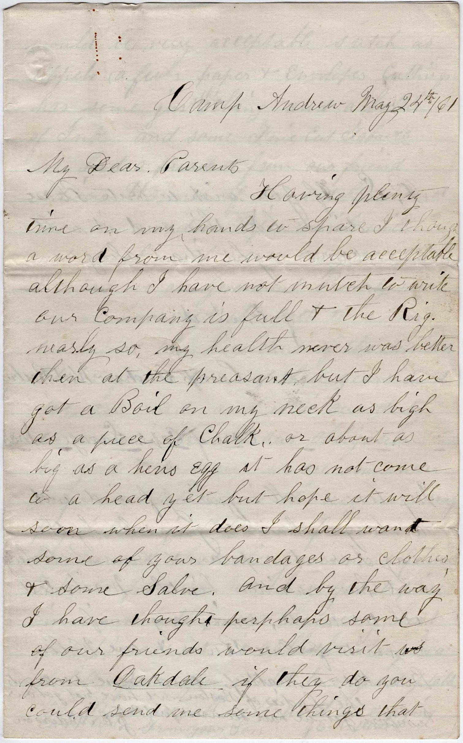 Having plenty time on my hands to spare, I thought a word from me would be acceptable although I have not much to write. Our company is full & the regiment nearly so. My health never was better than at the present but I have got a boil on my neck as big as a piece of chalk or about as big as a hen’s egg. It has not come to a head yet but hope it will soon. When it does, I shall want some of your bandages or cloths & some salve. And by the way, I have thought perhaps some of our friends would visit from Oakdale. If they do, you could send me some things that would be very acceptable such as apples (a few), paper & envelopes—Cuttings has some just the thing, and a bottle of ink, and some fine cut tobacco. We had a present from our friend Addison Hosmer of some tobacco and some wooden pipes which will not break which were very acceptable.