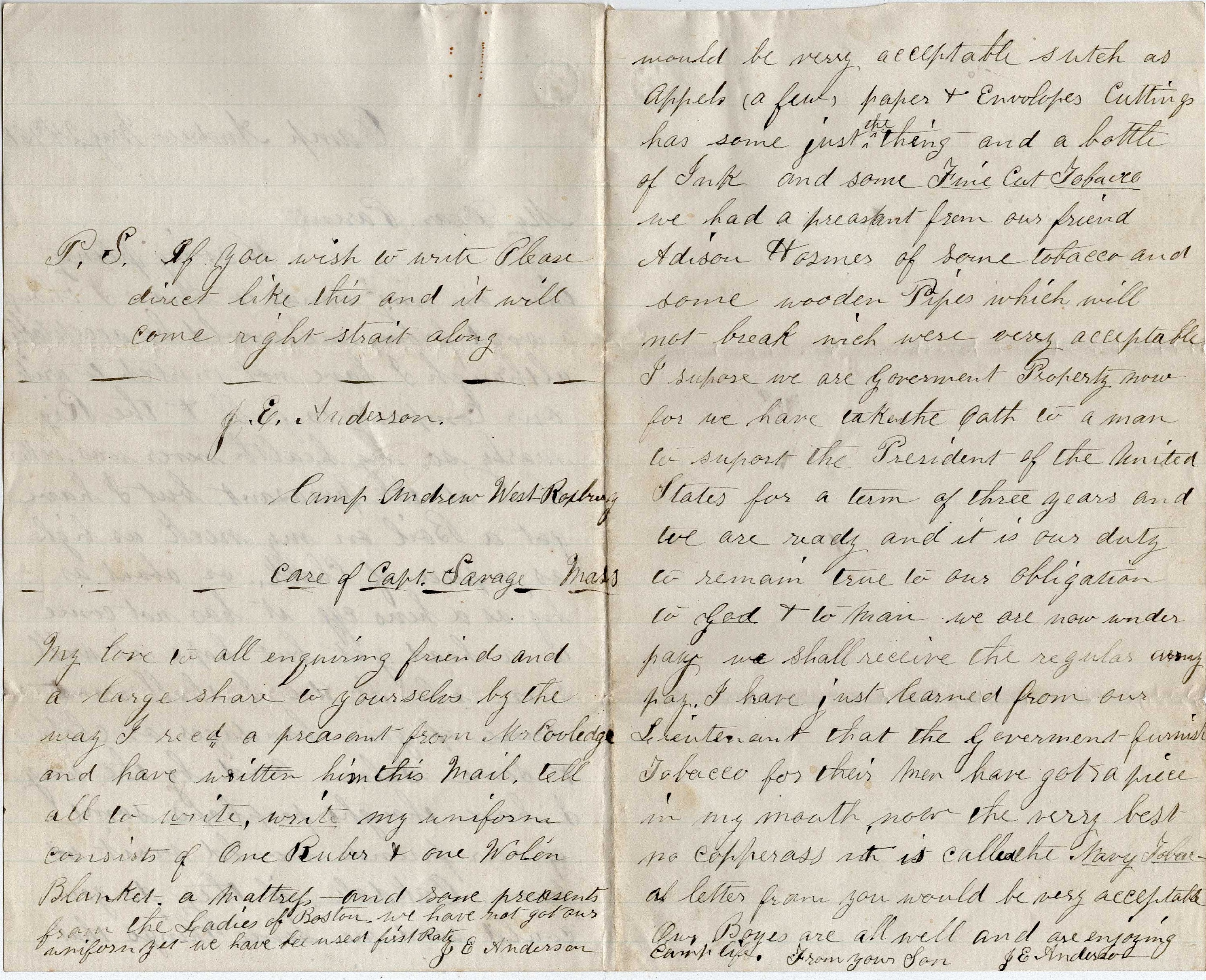 My love to all enquiring friends and a large share to yourselves. By the way, I received a present from Mr. Cooledge and have written him this mail. Tell all to write, write. My uniform consists of one rubber and one woolen blanket, a mattress, and some presents from the Ladies of Boston. We have not got our uniform yet. We have been used first rate. — J. E. Anderson
