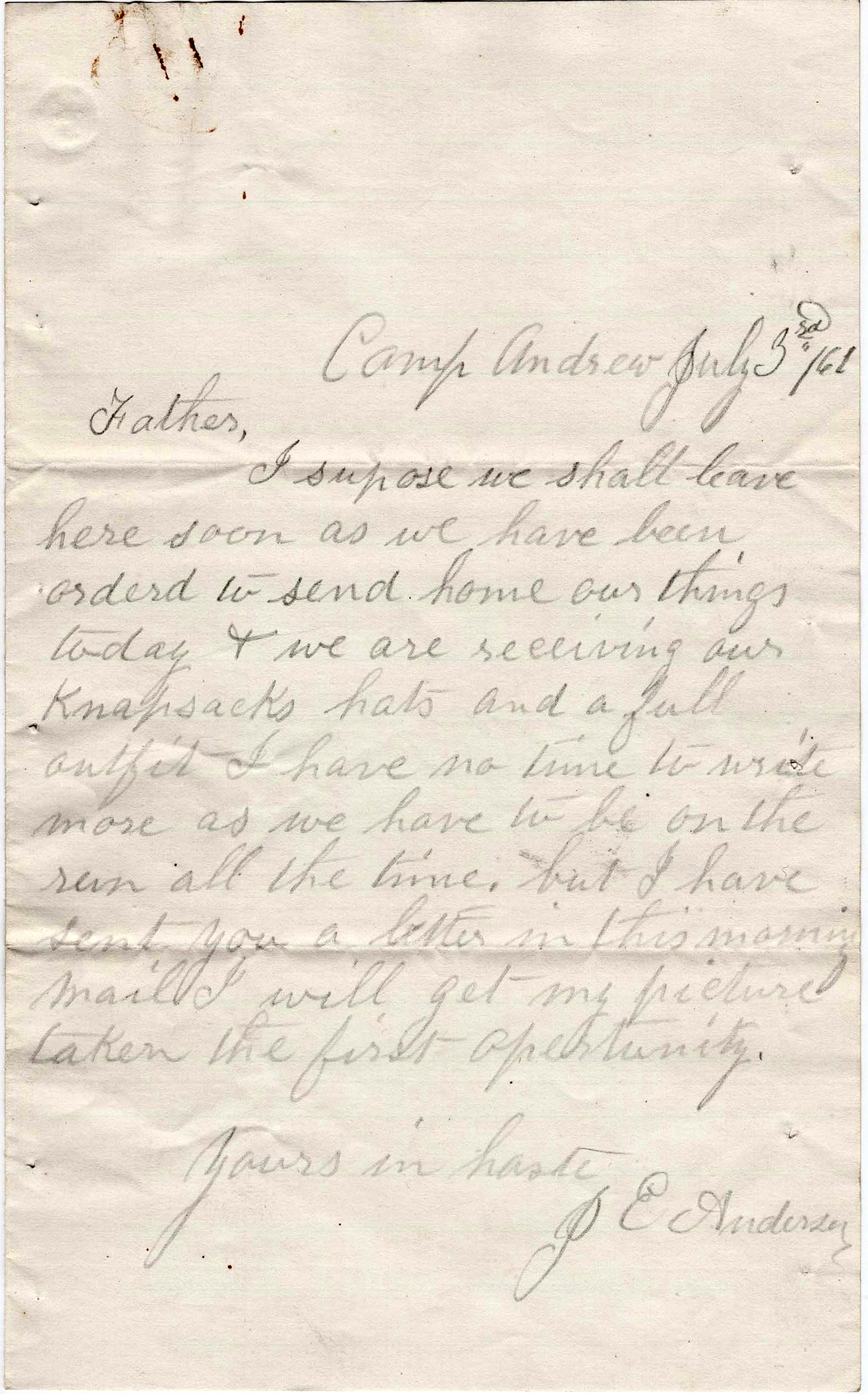 I suppose we shall leave here soon as we have been ordered to send home our things today & we are receiving our knapsacks, hats, and a full outfit. I have no time to write more as we have to be on the run all the time. But I have sent you a letter in this morning’s mail. I will get my picture taken the first opportunity. Yours in haste, — J. E. Anderson