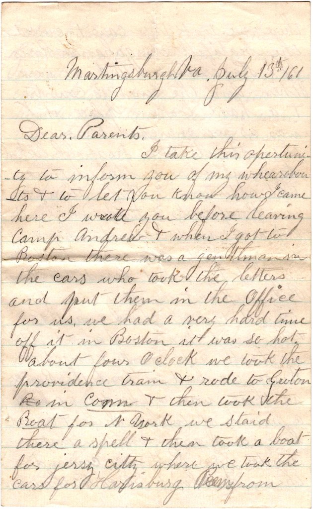 I take this opportunity to inform you of my whereabouts & to let you know how I came here. I wrote you before leaving Camp Andrew & when I got to Boston there was a gentleman in the cars who took the letters and put them in the Office for us. We had a very hard time of it in Boston—it was so hot. About four o’clock we took the Providence train and rode to Groton in Connecticut & then took the boat for New York. We stayed there a spell and then took a boat for Jersey City where we took the cars for Harrisburg, Pennsylvania. From there we took the cars and crossed the beautiful Susquehanna River for Hagerstown, Maryland. We were then in the enemy’s country & a hard looking place it was. As we marched through the streets, the people looked daggers at us. We stayed there till afternoon &then slung our knapsacks & prepared for a march, we knew not where.