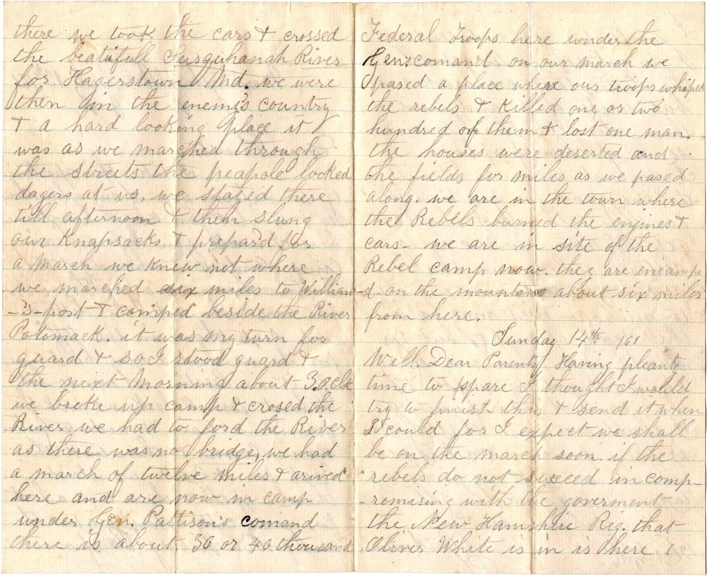 We marched six miles to Williamsport & camped beside the river Potomac. It was my turn for guard & so I stood guard and the next morning about 3 o’clock we broke up camp and crossed the river. We had to for the river as there was no bridge. We had a march of twelve miles & arrived here and are now in camp under Gen. [Robert] Patterson’s command. There is about 30 or 40 thousand Federal troops here under the General’s command. On our march, we passed a place where our troops whipped the rebels & killed one or two hundred of them & lost one man. The houses were deserted and the fields for miles as we passed along.