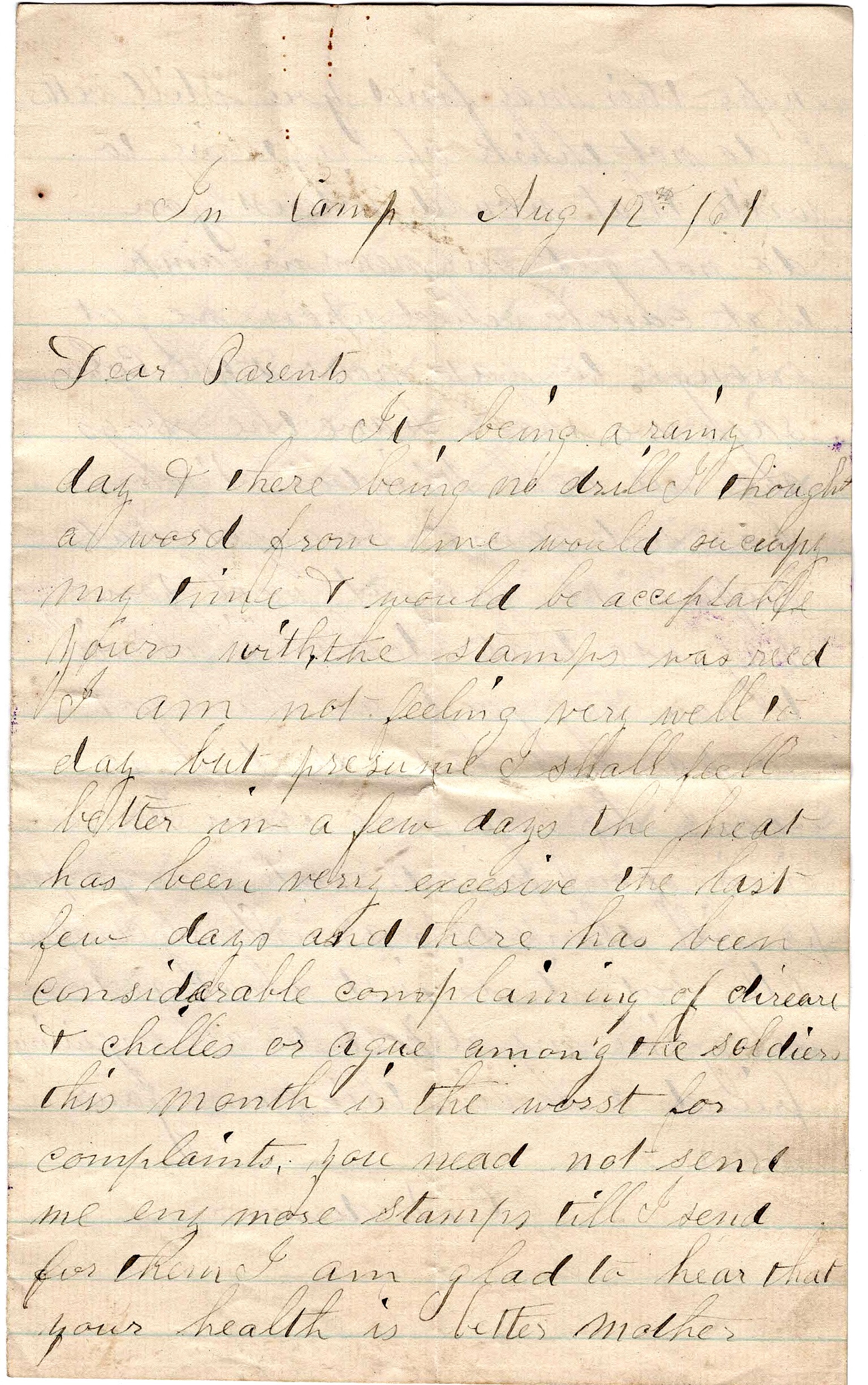 It being a rainy day and there being no drill, I thought a word from me would occupy my time & would be acceptable. Yours with the stamps was received. I am not feeling very well today but presume I shall feel better in a few days. The heat has been very excessive the last few days and there has been considerable complaining of diarrhea and chills or ague among the soldiers. This month is the worst for complaints. You need not send me any more stamps till I send for them.