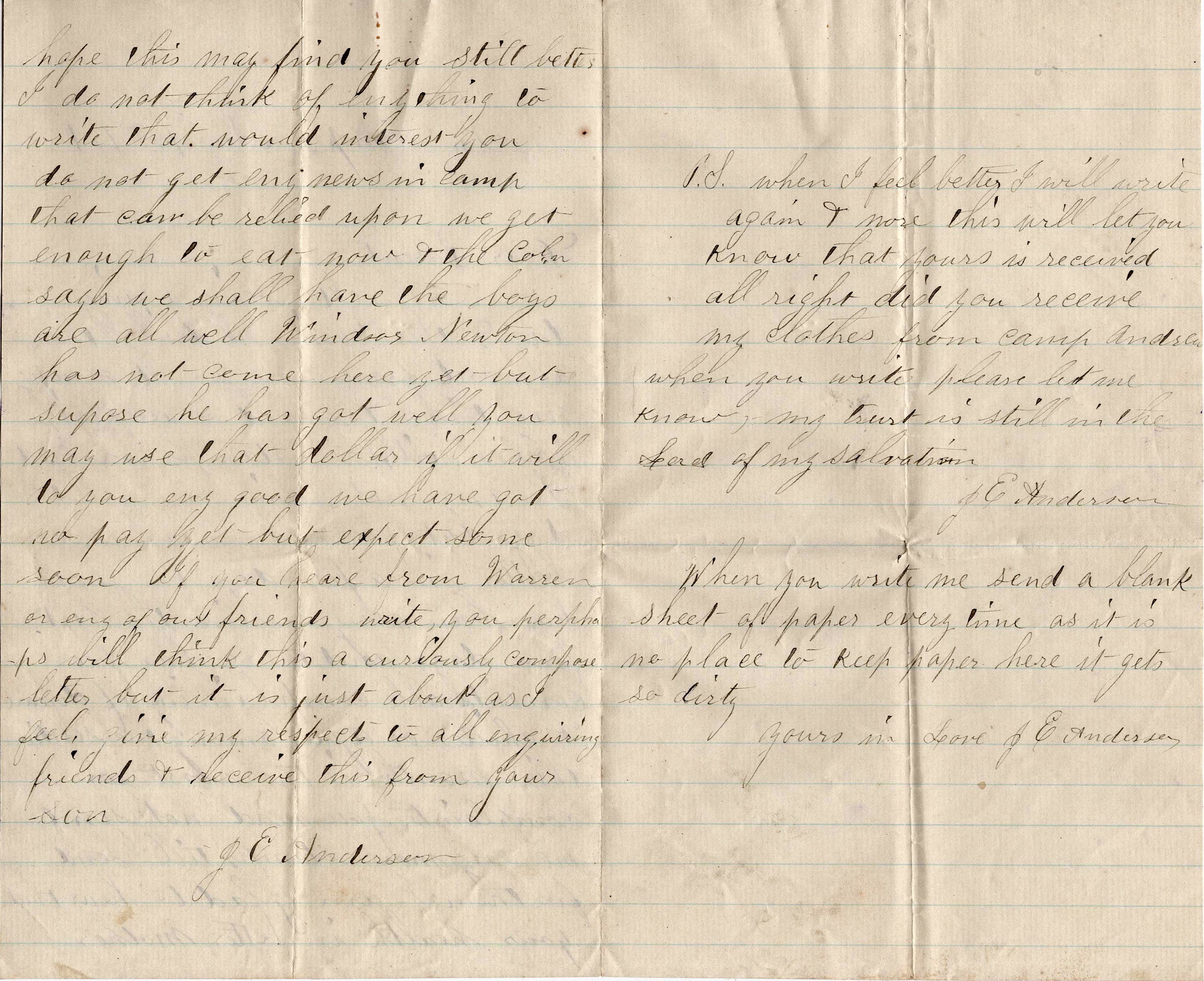 P. S. When I feel better, I will write again & more. This will let you know that yours is received all right. Did you receive my clothes from Camp Andrew? When you write, please let me know. My trust is still in the Lord of my salvation. — J. E. Anderson