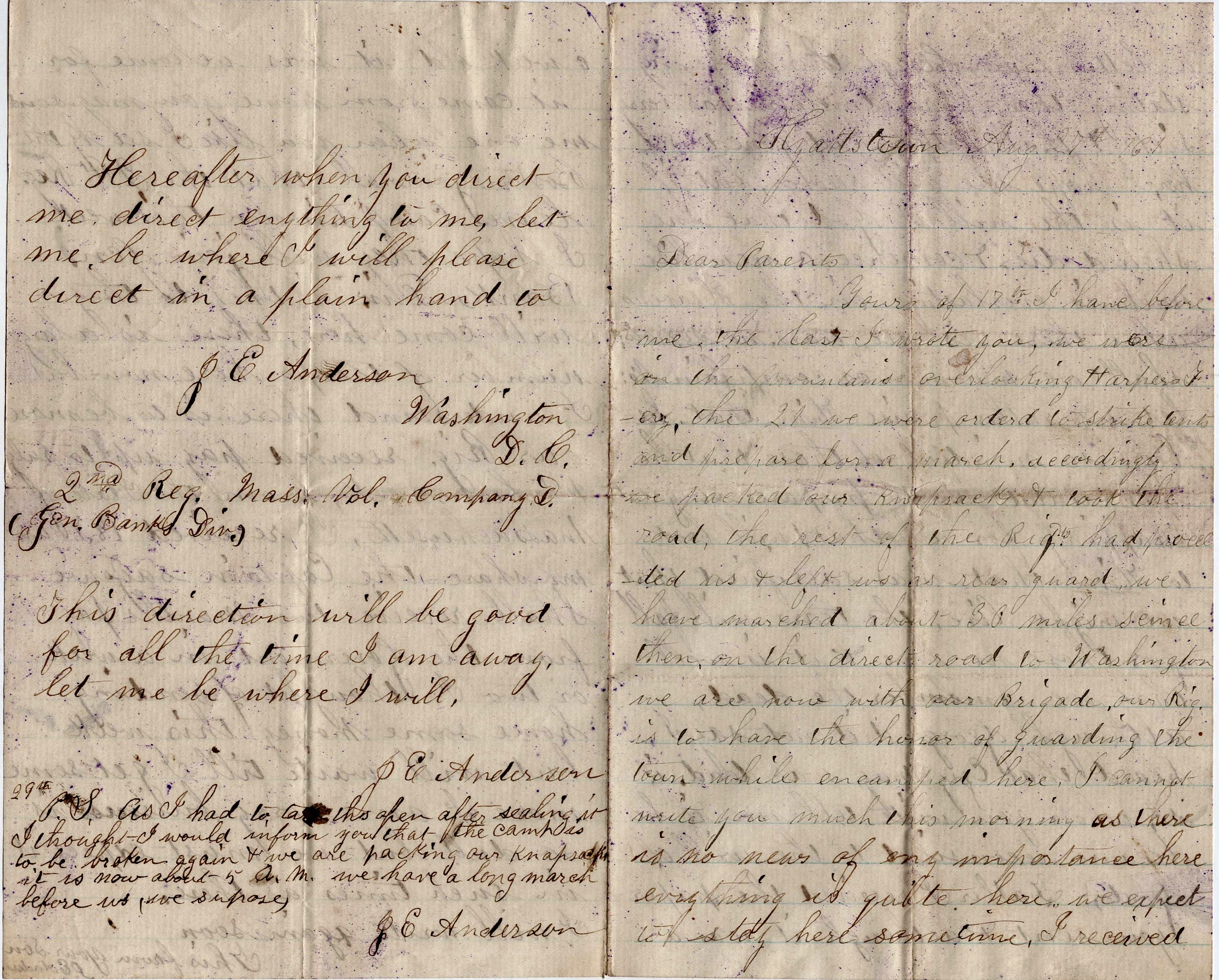 P. S. I had to open this after sealing it. I thought I would inform you that the camp is to be broken again and we are packing our knapsacks. It is now about 5 a.m. We have a long march before us (we suppose). — J. E. Anderson