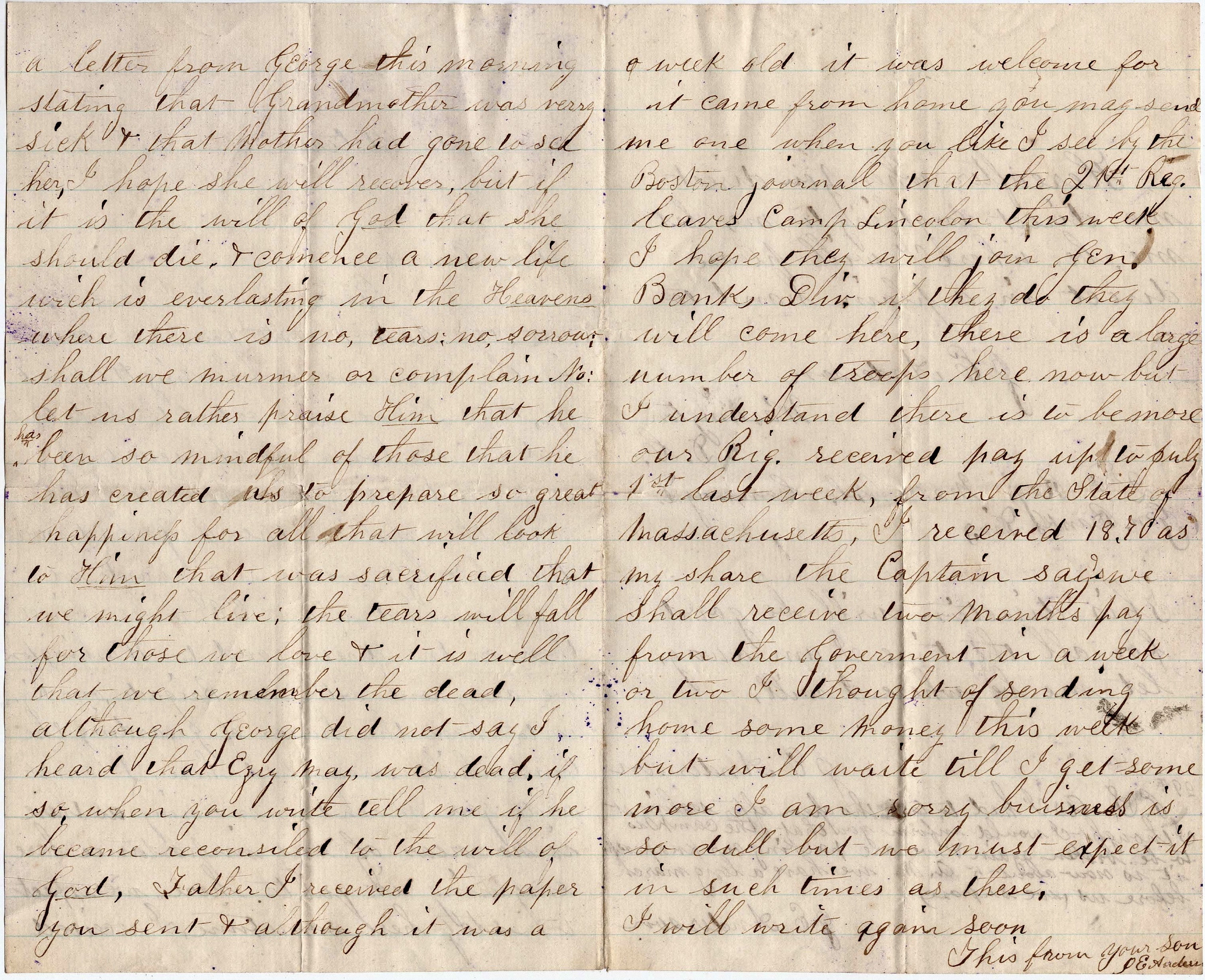 Our Brigade received pay up to July 1st last week from the State of Massachusetts. I received 18.70 as my share. The Captain says we shall receive two months pay from the government in a week or two. I thought of sending home some money this week but will wait till I get some more. I am sorry business is so dull but we must expect it in such times as these. I will write again soon. This from your son, — J. E. Anderson