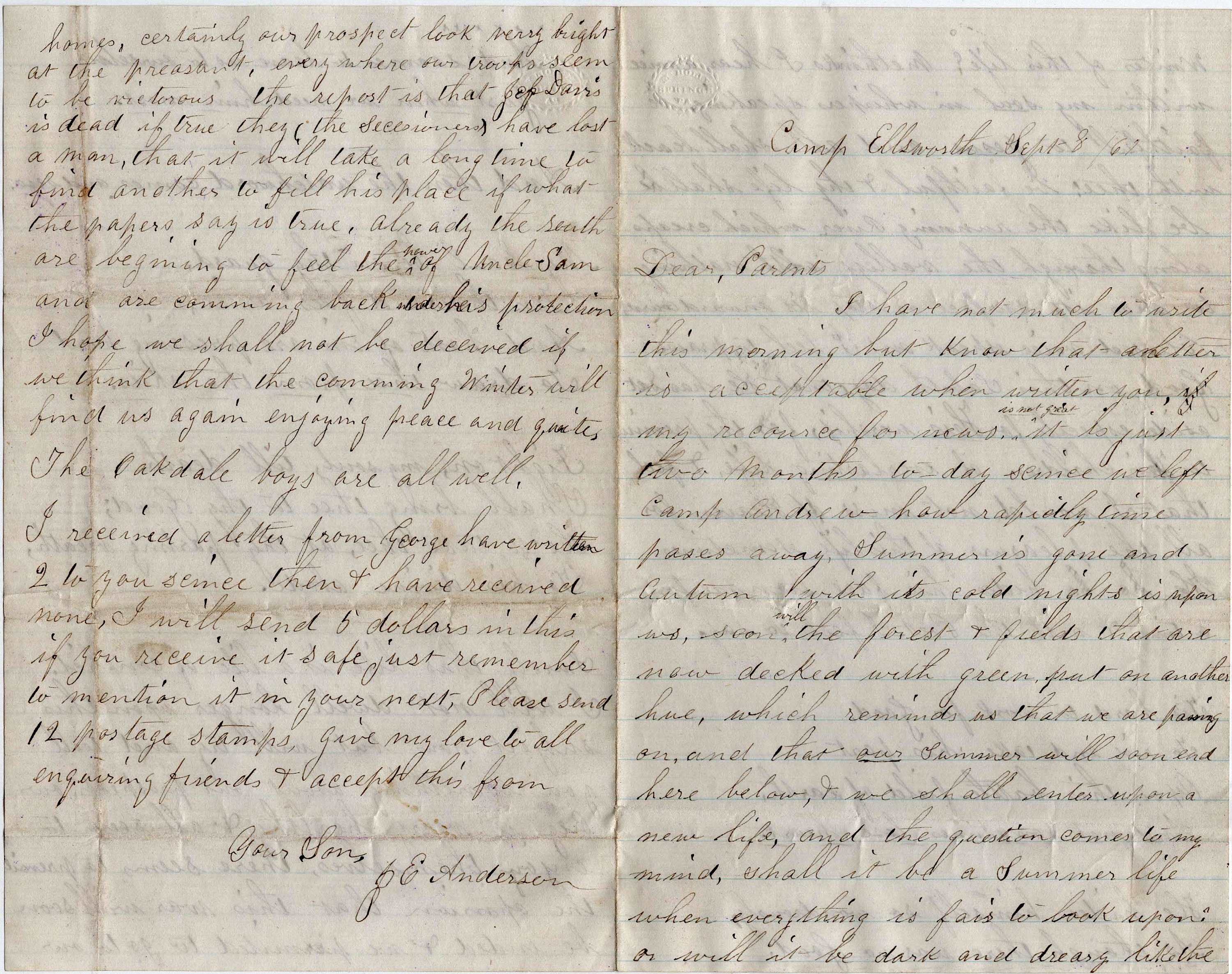 The Oakdale Boys are all well. I received a letter from George. Have written two to you since then & have received none. I will send 5 dollars in this. If you receive it safe, just remember to mention it in your next. Please send 12 postage stamps. Give my love to all enquiring friends & accept this from your son, — J. E. Anderson
