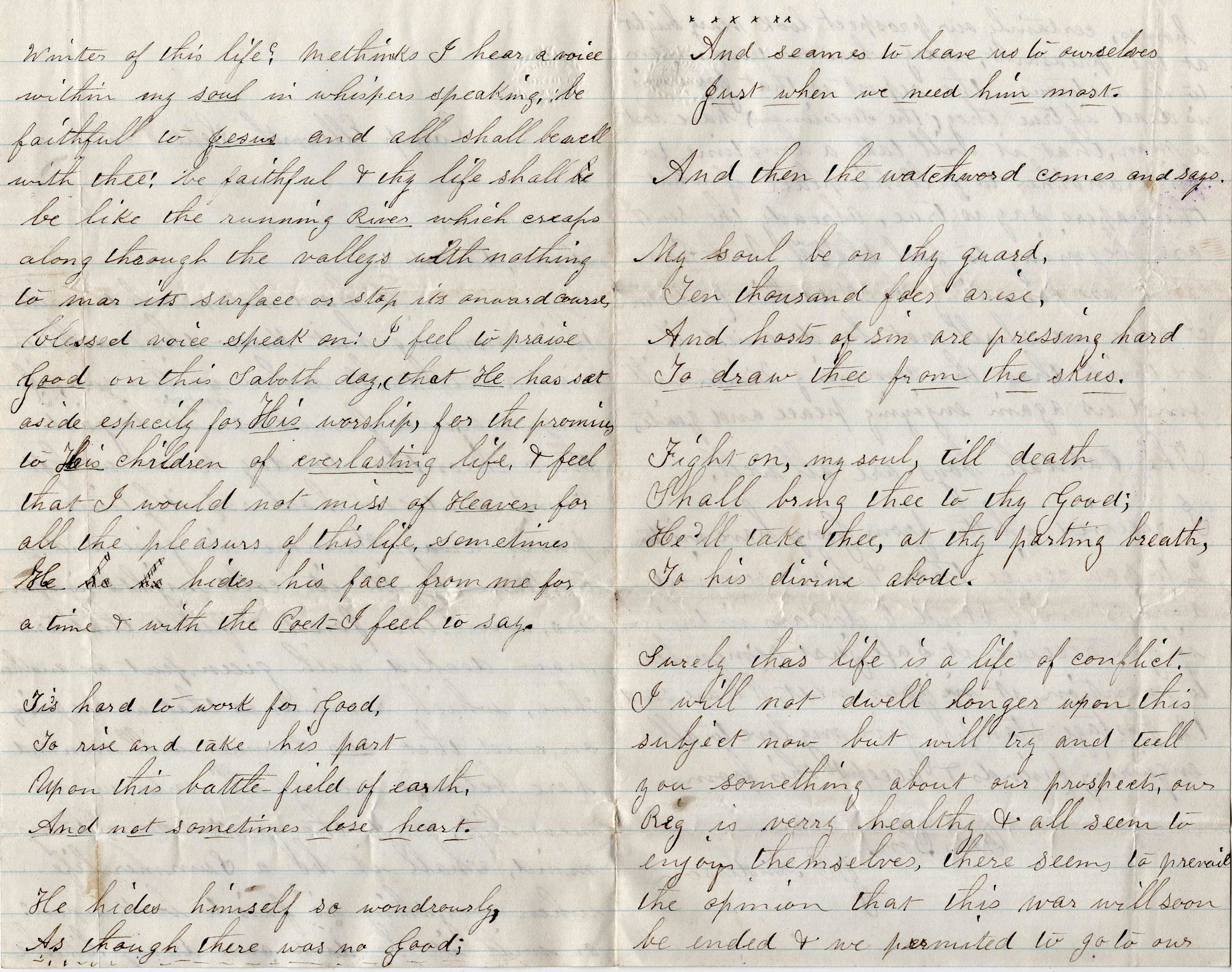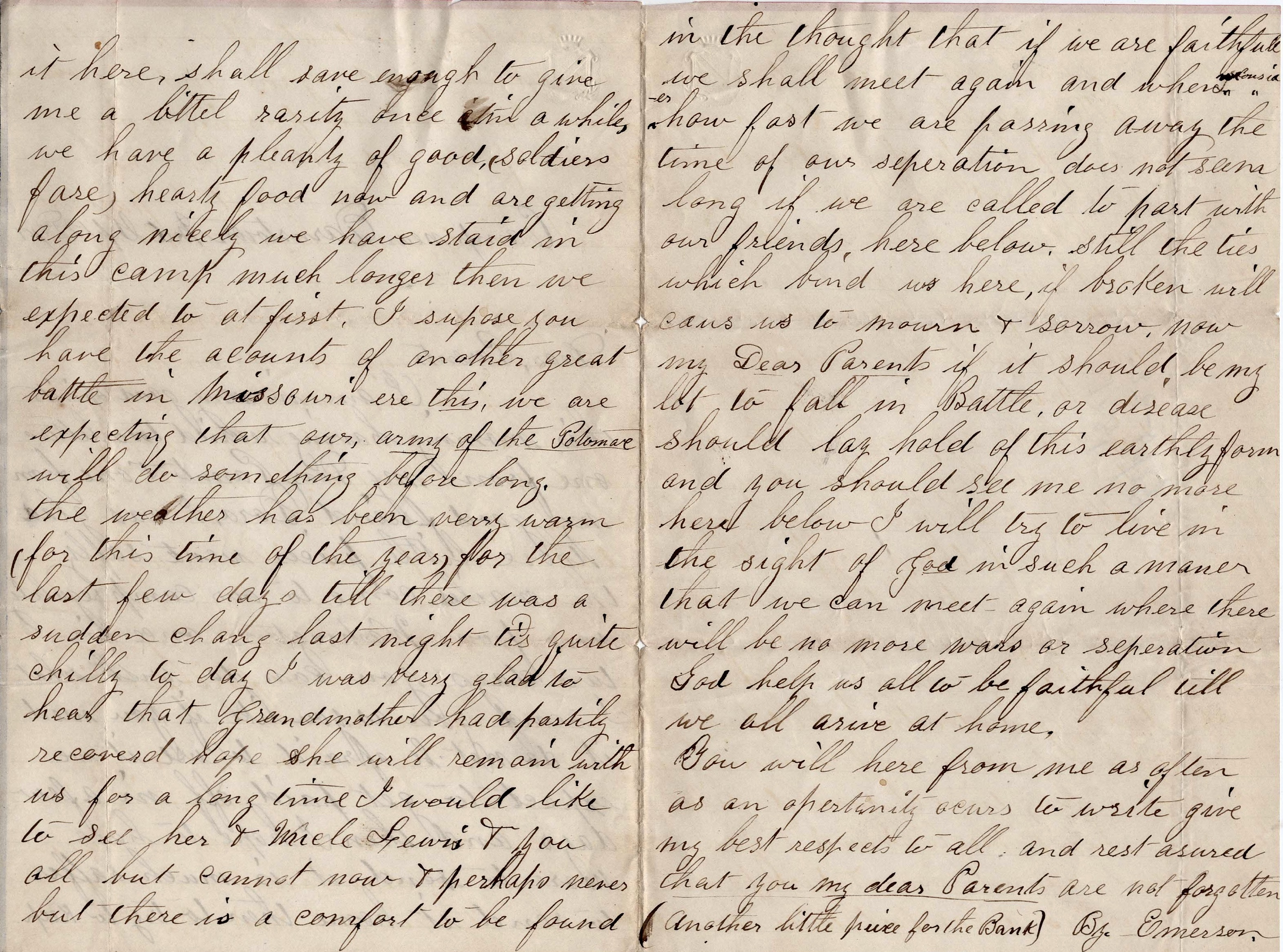 Now my dear parents, if it should be my lot to fall in battle or disease should lay hold of this earthly form, and you should see me no more here below, I will try to live in the sight of God in such a manner that we can meet again where there will be no more wars or separation. God help us all to be faithful till we arrive at home.
