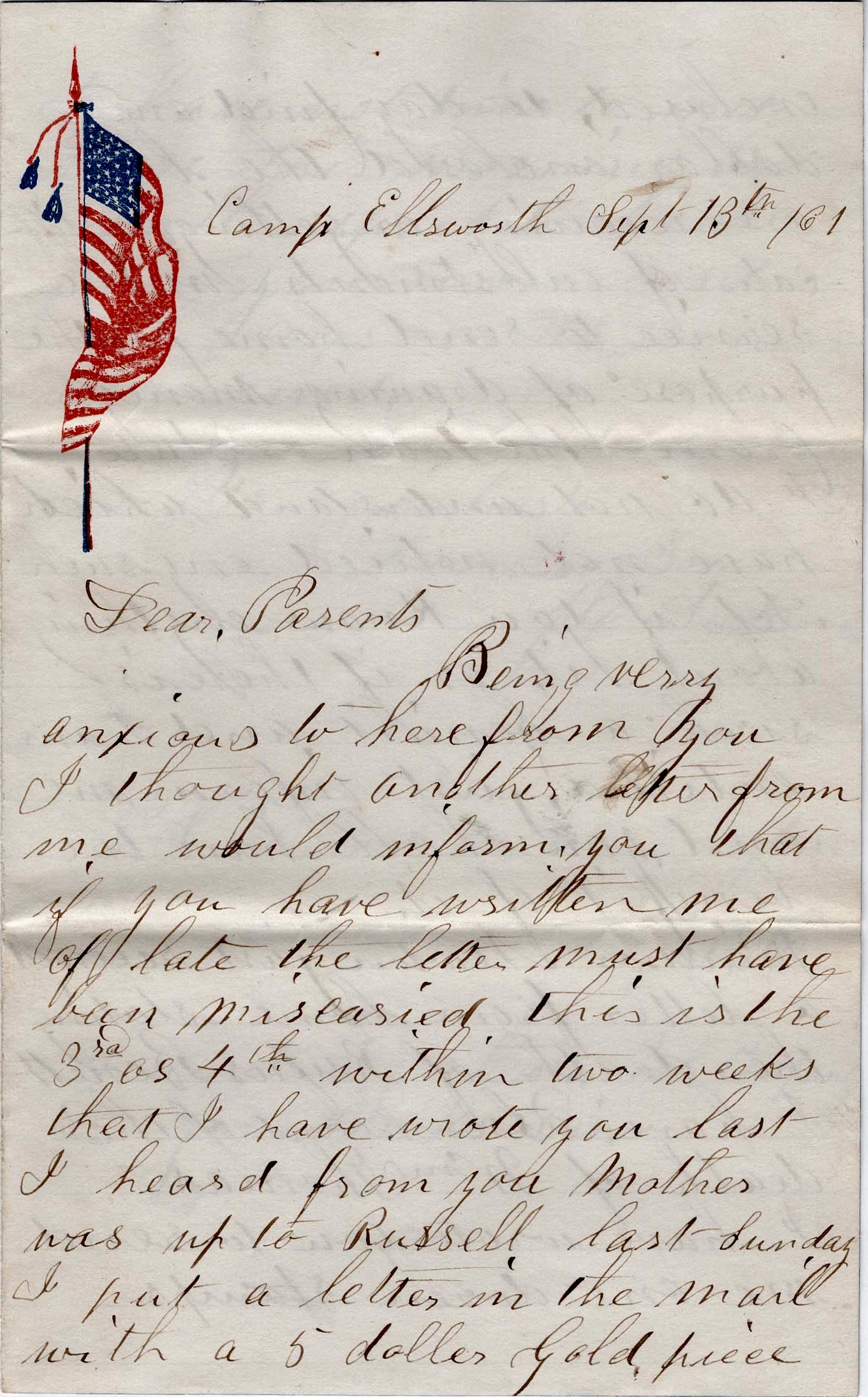 Being very anxious to hear from you, I thought another letter from me would inform you that if you have written me of late, the letter must have miscarried. This is the 3rd or 4th within two weeks that I have wrote you last I heard from you. Mother was up to Russell last Sunday. I put a letter in the mail with a five dollar gold piece enclosed. Today find one dollar enclosed.