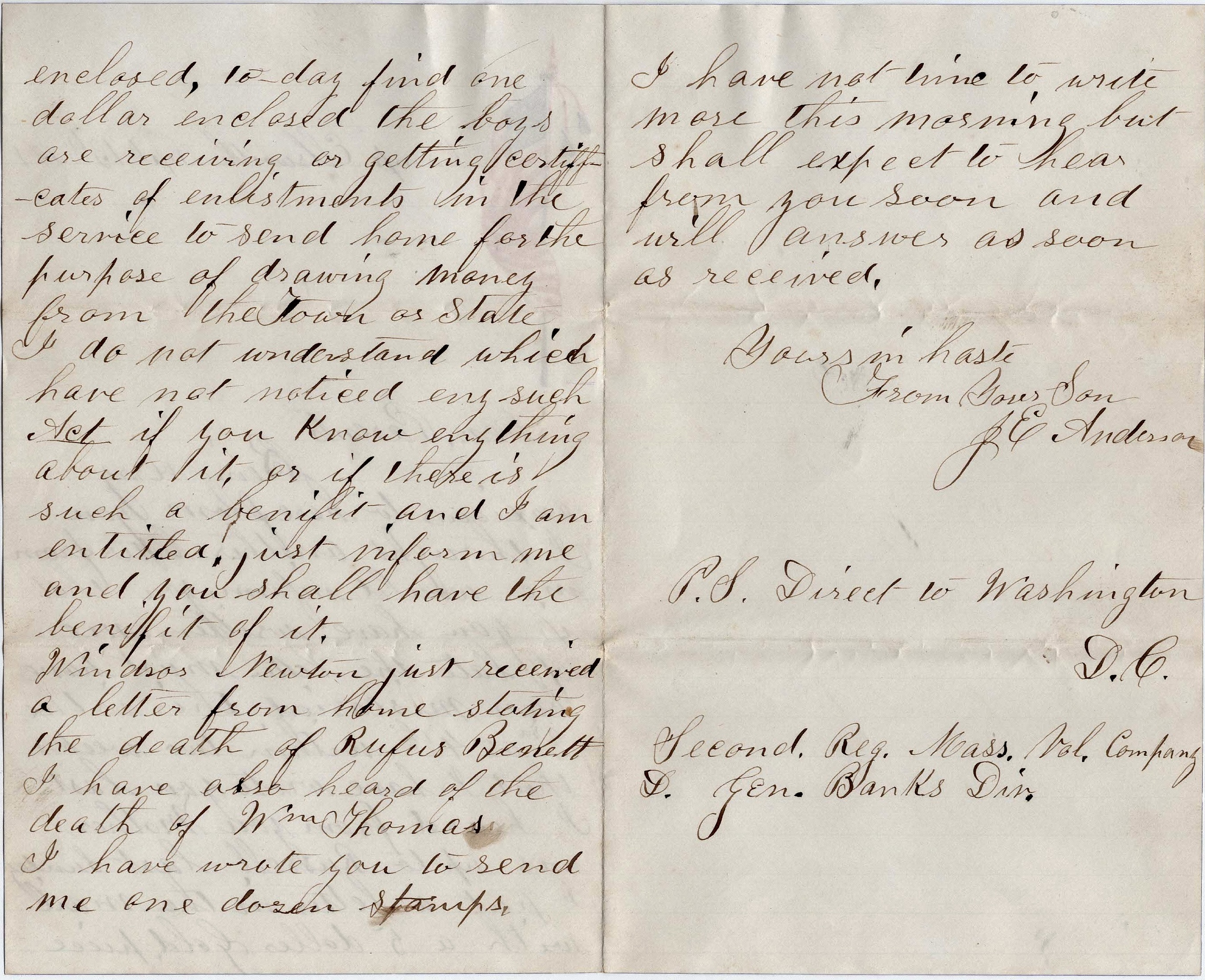 Windsor Newton just received a letter from home stating the death of Rufus Bennett. I have also heard of the death of Wm. Thomas. I have wrote you to send me one dozen stamps. I have not time to write more this morning but shall expect to hear from you soon and will answer as soon as received. Yours in haste. From your son, — J. E. Anderson