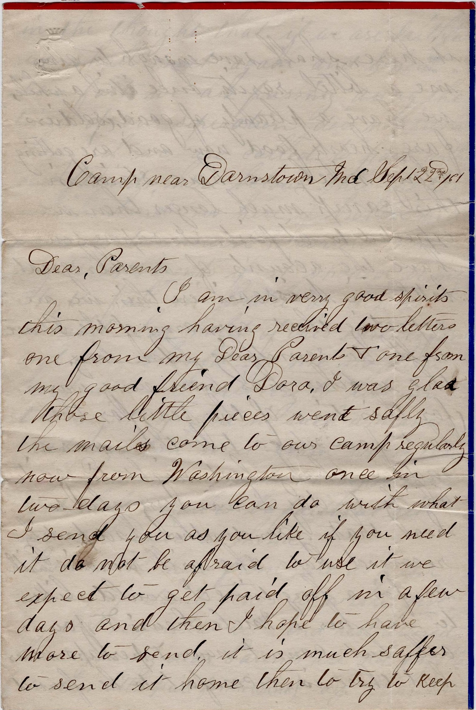 I am in very good spirits this morning having received two letters—one from my dear parents, and one from my good friend Dora. I was glad those little pieces went safely. The mails come to our camp regularly now from Washington—once in two days. You can do with what I send you as you like, if you need it. Do not be afraid to use it. We expect to get paid off in a few days and then I hope to have more to send. It is much safer to send it home than to try to keep it here. Shall save enough to give me a little rarity once in a while. We have plenty of good soldier’s fare—hearty food now, and are getting along nicely. We have stayed in this camp much longer than we expected to at first.