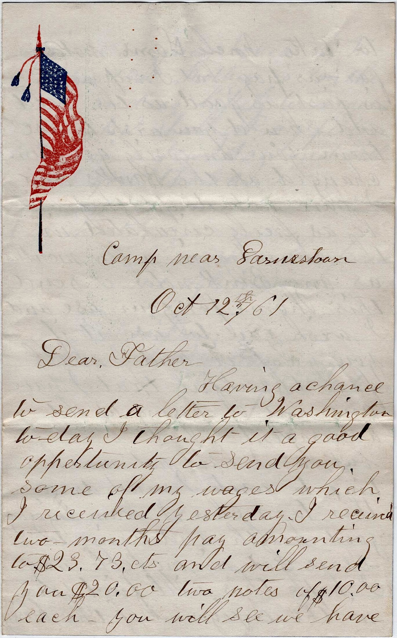 Having a chance to send a letter to Washington today, I thought it a good opportunity to send you some of my wages which I received yesterday. I received two months pay amounting to $23.73 and will send you $20—two notes of $10 each. You will see we have to take Uncle Sam’s notes for our pay but I suppose it is just as good as the gold and should you wish to use them, you can easily get them changed at the banks and I have no doubt they will be as freely circulated in the country in a few months as any bank notes. I send this home for your use and I wish you to use it if you want it and I shall feel thankful that I have any way of paying up old arrearages.
