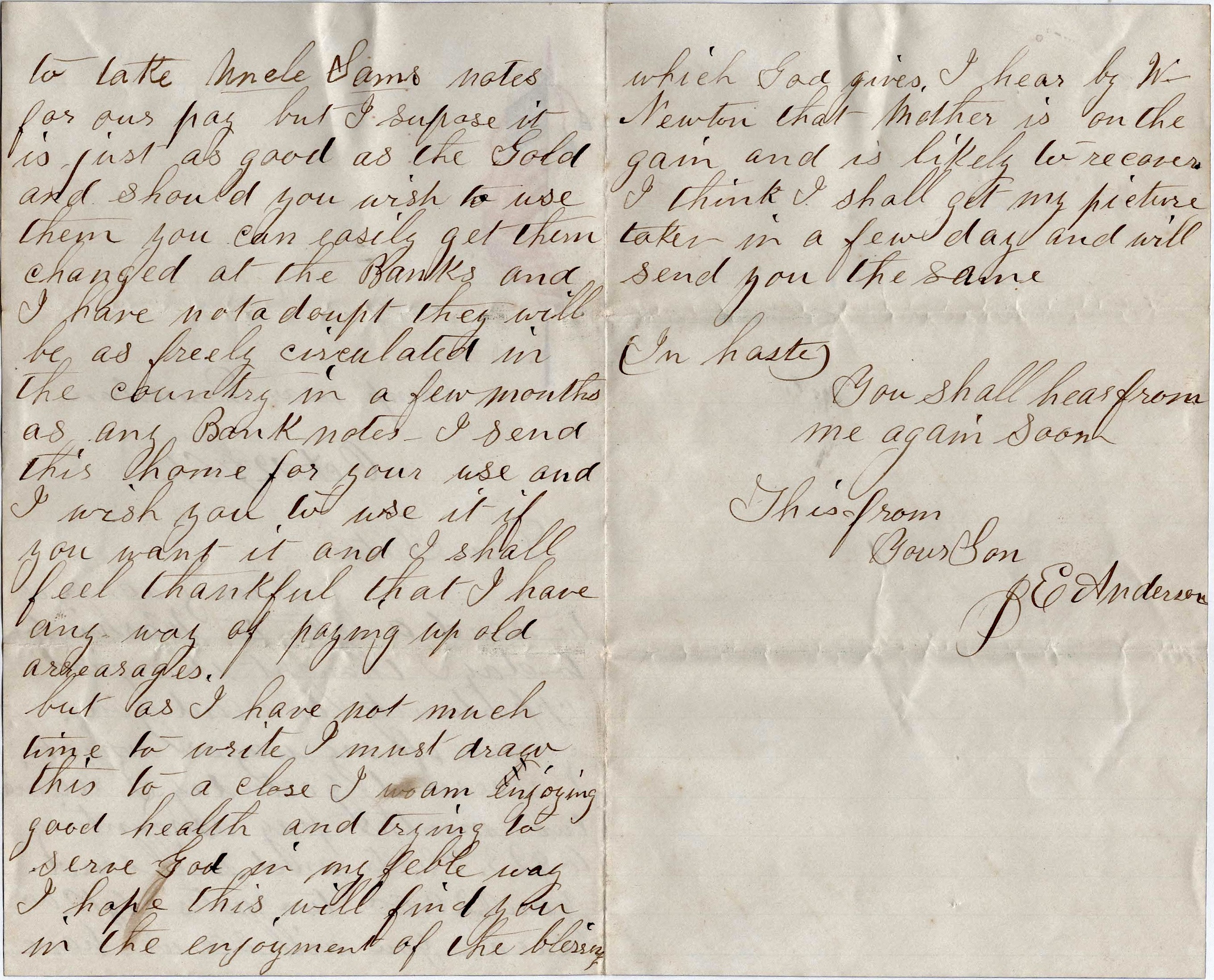 I hear by W. Newton that Mother is on the gain and is likely to recover. I think I shall get my picture taken in a few days and will send you the same. In haste. You shall hear from me again soon. This from your son, — J. E. Anderson
