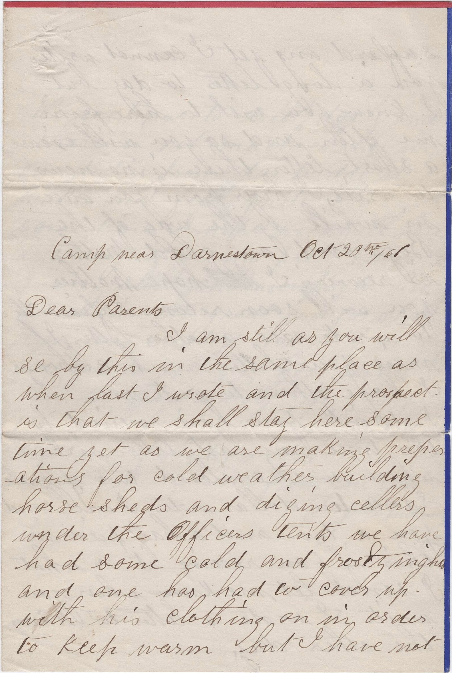 I am still as you will see by this in the same place as when last I wrote and the prospect is that we shall stay here some time yet as we are making preparations for cold weather, building horse sheds, and digging cellars under the officers’ tents. We have had some cold and frosty nights and one has had to cover up with his clothing on in order to keep warm. But I have not suffered any yet.