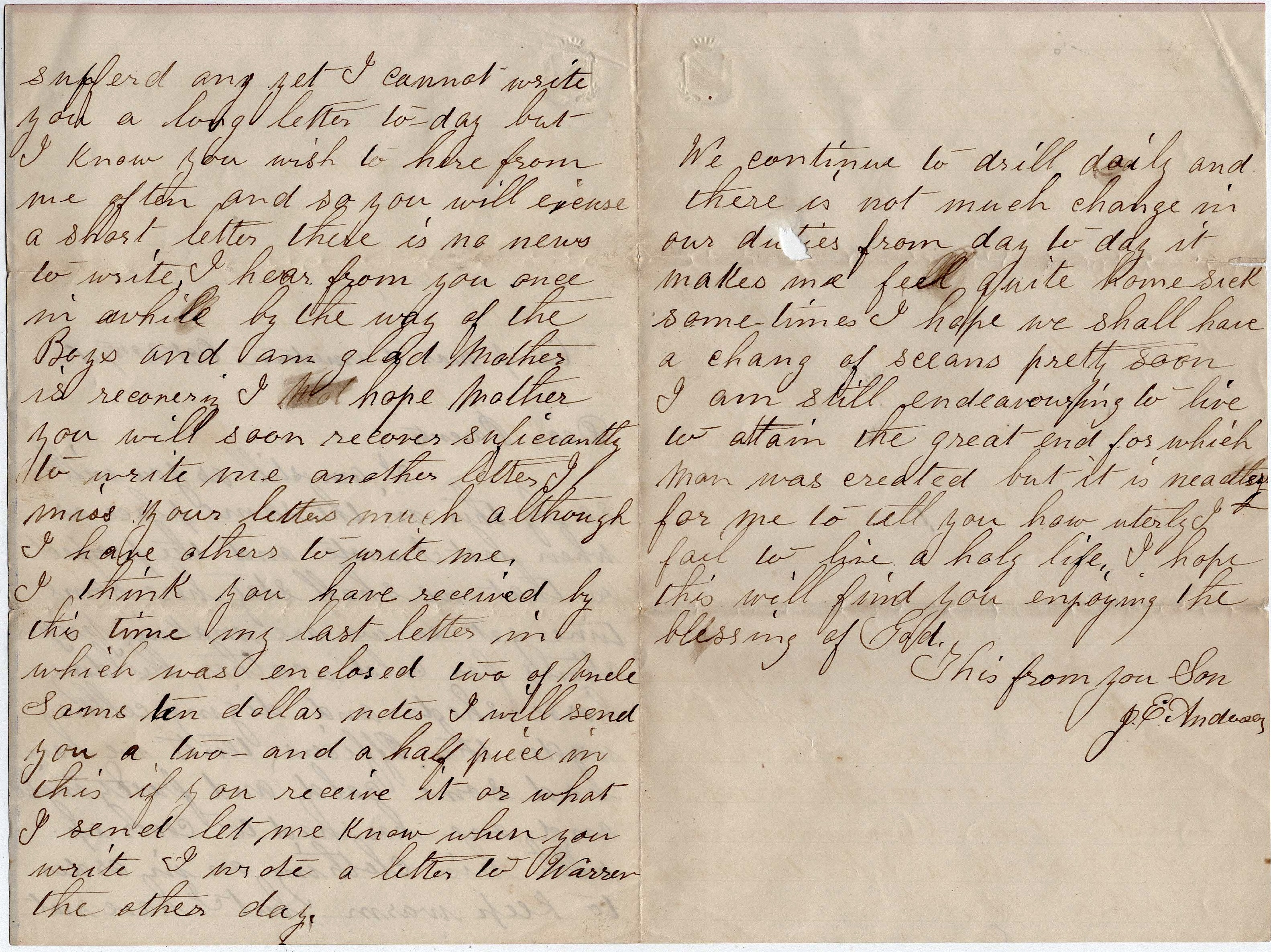 I think of no more news to write you now. I will enclose a ten dollar note in this trusting that you will receive it all safe. This from your son, — J. E. Anderson