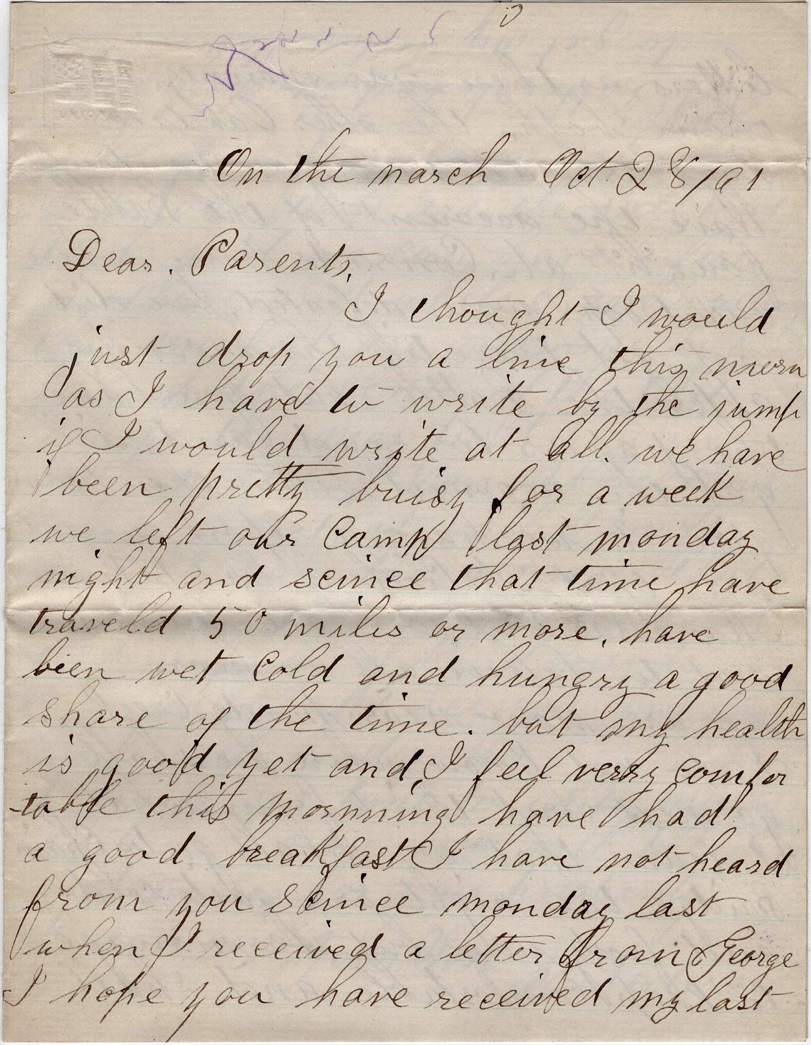 I thought I would just drop you a line this morn as I have to write by the jump if I would write at all. We have been pretty busy for a week. we left our camp last Monday night and since that time have traveled 50 miles or more. Have been wet, cold and hungry a good share of the time but my health is good yet and I feel very comfortable this morning. Have had a good breakfast. I have not heard from you since Monday last when I received a letter from George. I hope you have received my last letters as there was money in them both.