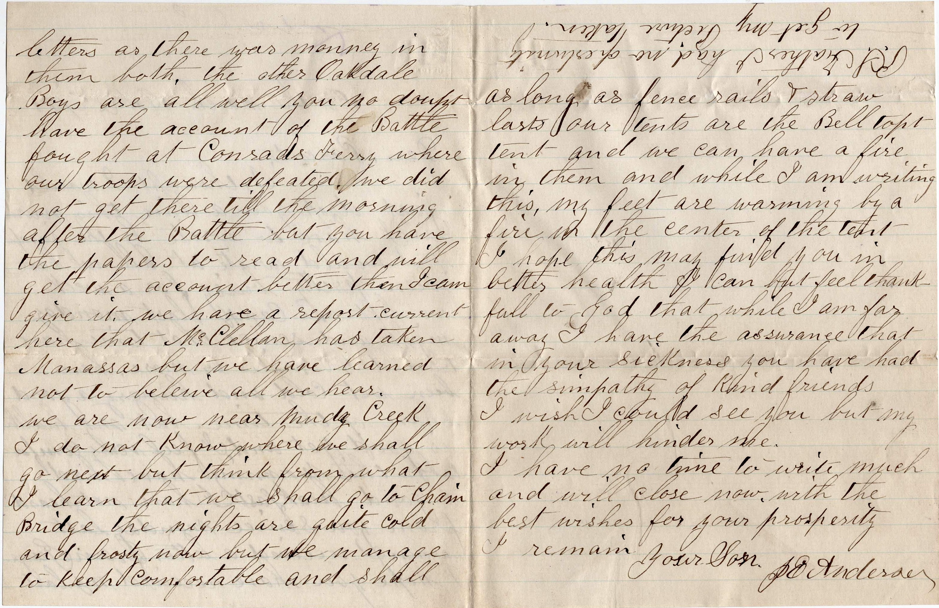 The other Oakdale Boys are all well. You no doubt have the account of the battle fought at Conrad’s Ferry where our troops were defeated. We did not get there till the morning after the battle but you have the papers to read and will get the account better than I can give it.
