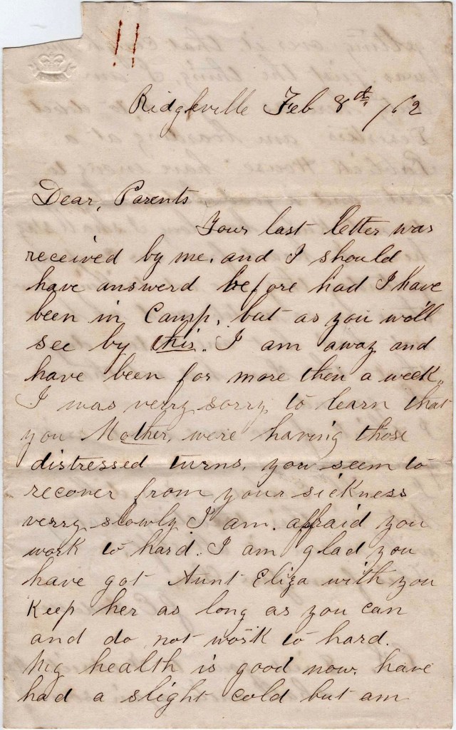 Your last letter was received by me and I should have answered before had I have been in camp, but as you will see by this, I am away and have been for more than a week. I was very sorry to learn that you, Mother, were having those distressed turns. You seem to recover from your sickness very slowly. I am afraid you work too hard. I am glad you have got Aunt Eliza with you. Keep her as long as you can and do not work too hard.