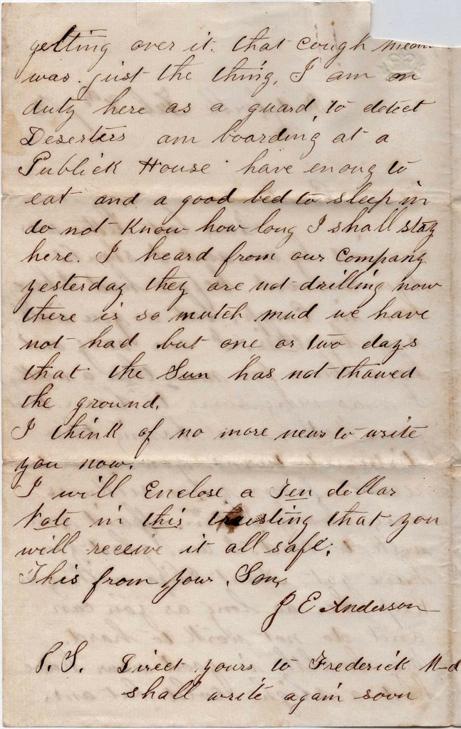 My health is good now. Have had a slight cold but am getting over it. That cough medicine was just the thing. I am on duty here as a guard to detect deserters. Am boarding at a public house. Have enough to eat and a good bed to sleep in. Do not know how long I shall stay here. I have heard from our company yesterday. They are not drilling now—ther is so much mud. We have not had but one or two days that the sun has not thawed the ground.