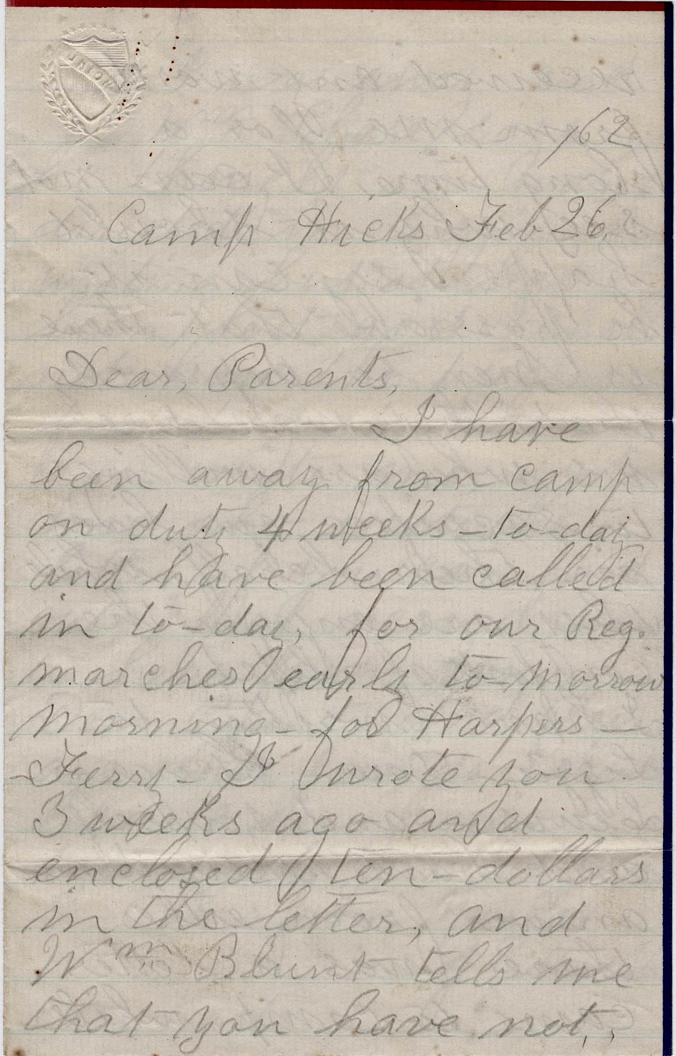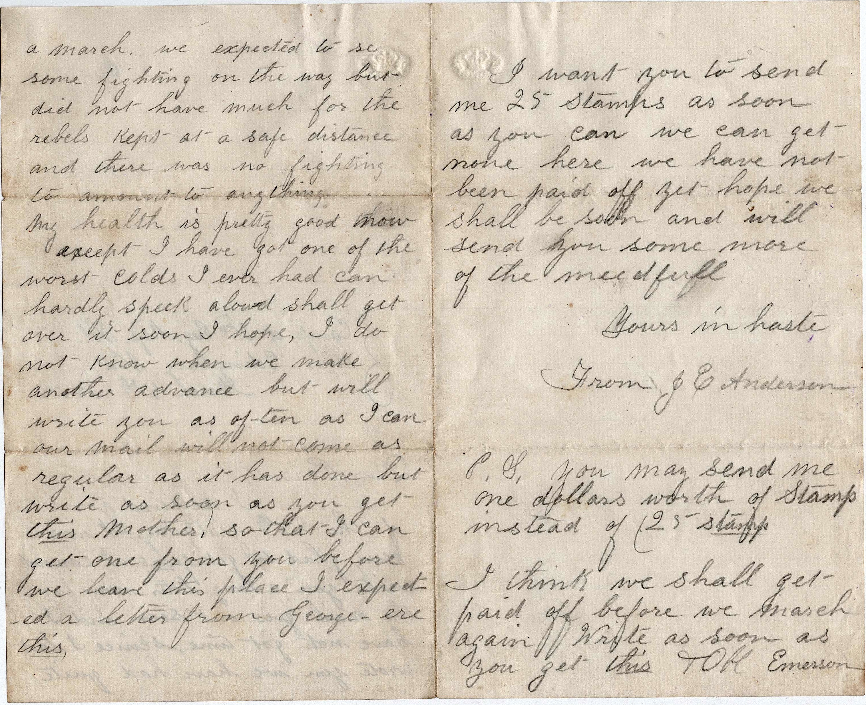 P. S. You may send me one dollar’s worth of stamps instead of 25 stamps. I think we shall get paid off before we march again. Write as soon as you get this. — Emerson