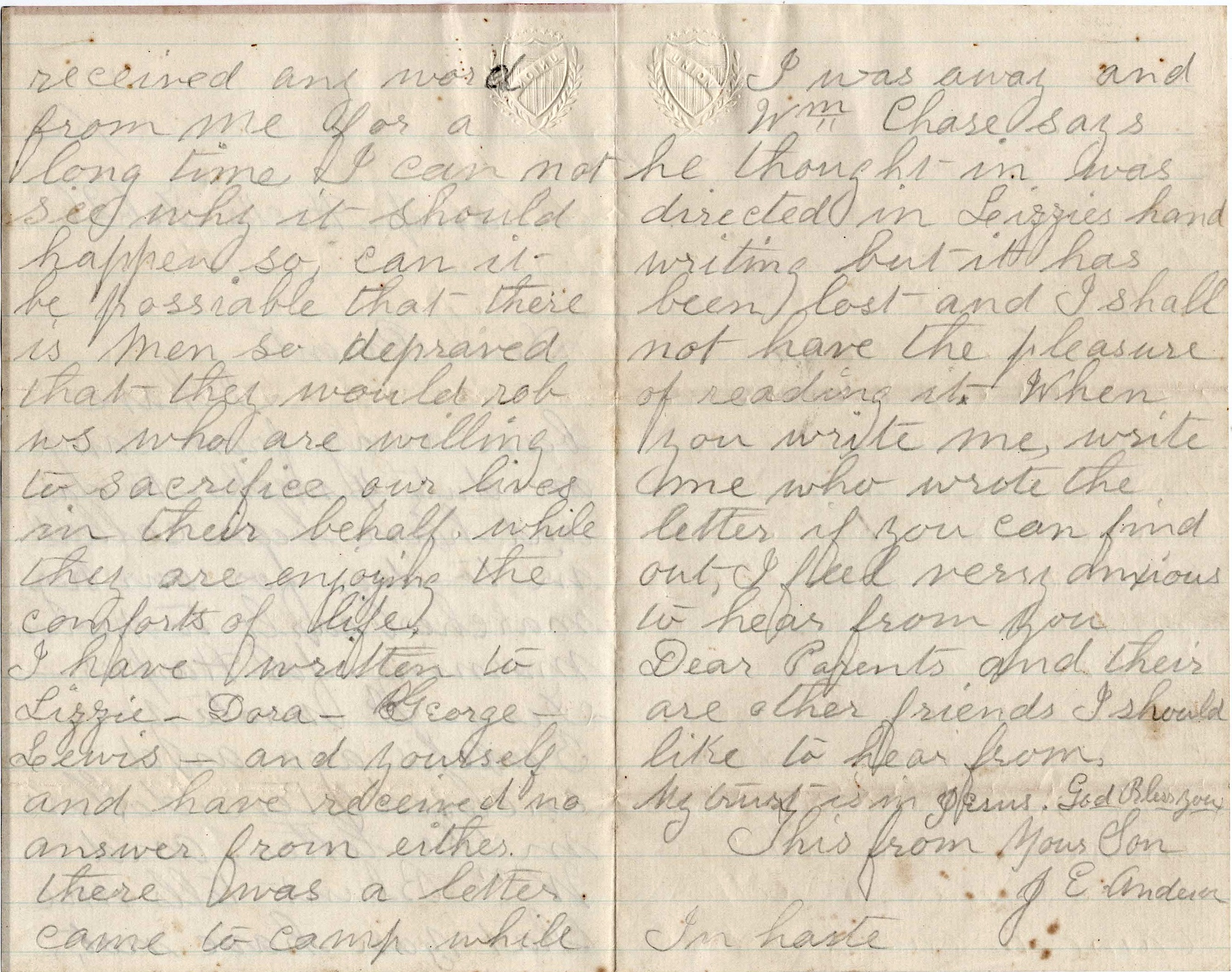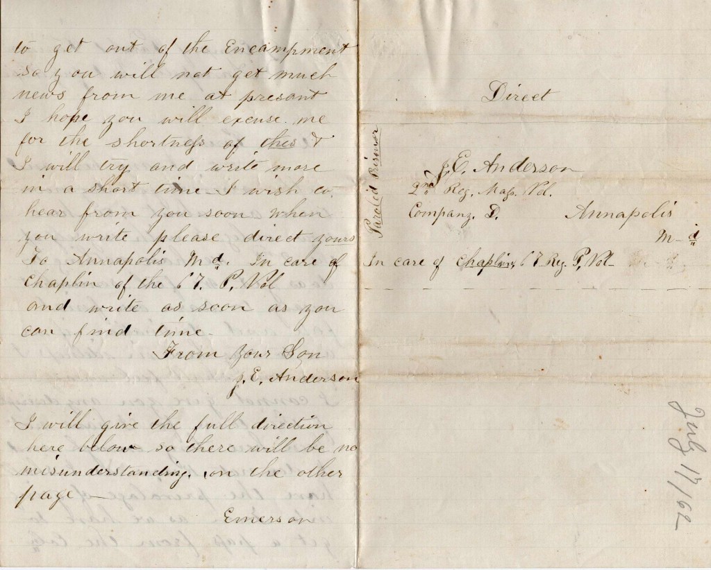 I hope you will excuse me for the shortness of this and I will try and write more in a short time. I wish to hear from you soon. When you write, please direct yours to Annapolis, Maryland in care of Chaplain of the 67th Penn. Vols. and write as soon as you can find time. From your son, — J. E. Anderson