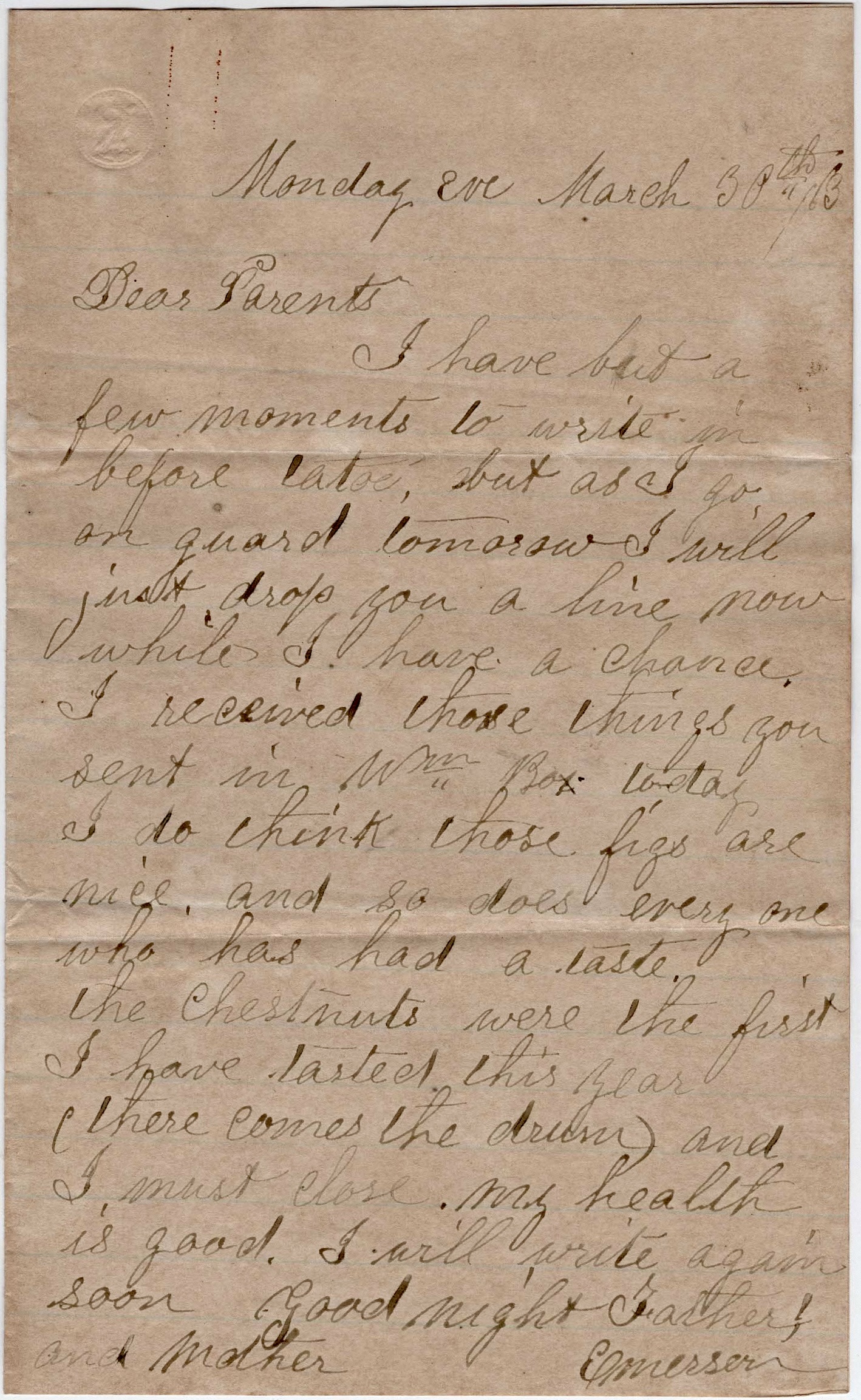 I have but a few moments to write in before tattoo, but as I go on guard tomorrow, I will just drop you a line now while I have a chance. I received those things you sent in William’s box today. I do think those figs are nice and so does everyone who has had a taste. The chestnuts were the first I have tasted this year. (There comes the drum) and I must close. My health os good. I will write again soon. Good night Father and Mother. — Emerson