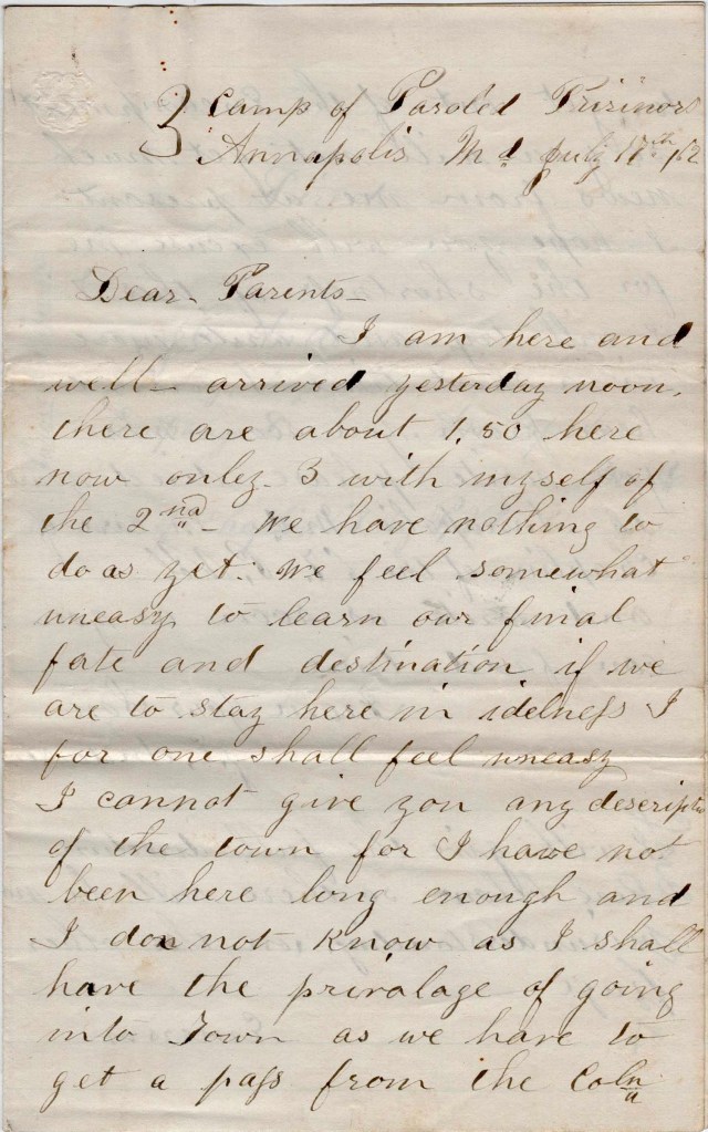 I am here and well. Arrived yesterday noon. There are about 150 here now, only three with myself of the 2nd [Massachusetts]. We have nothing to do as yet. We feel somewhat uneasy to lear our final fate and destination. If we are to stay here in idleness, I for one shall feel uneasy. I cannot give you any description of the town for I have not been here long enough and I do not know as I shall have the privilege ofgoing into town as we have to get a pass from the Colonel to get out of the encampment so you will not get much news from me at present.