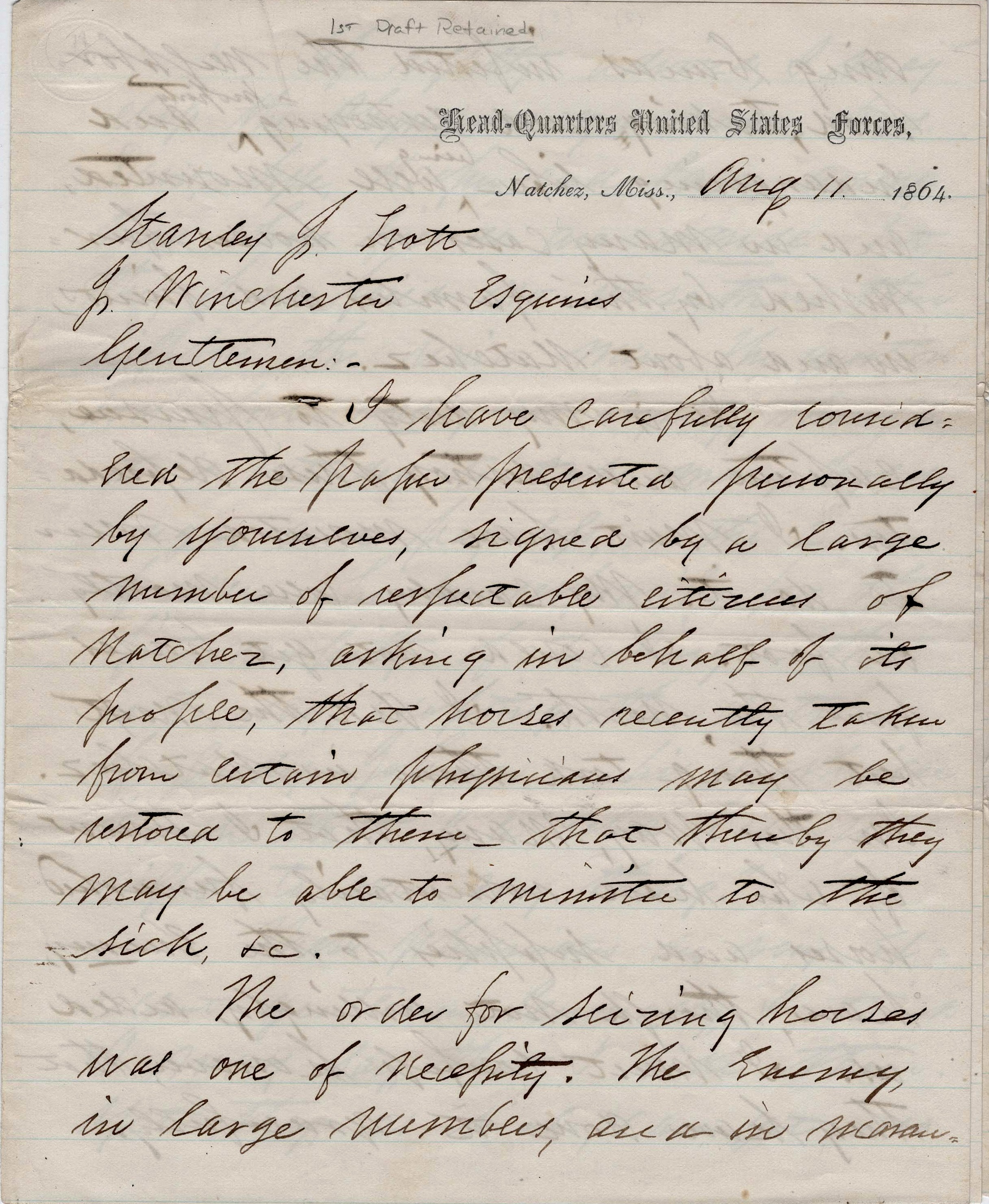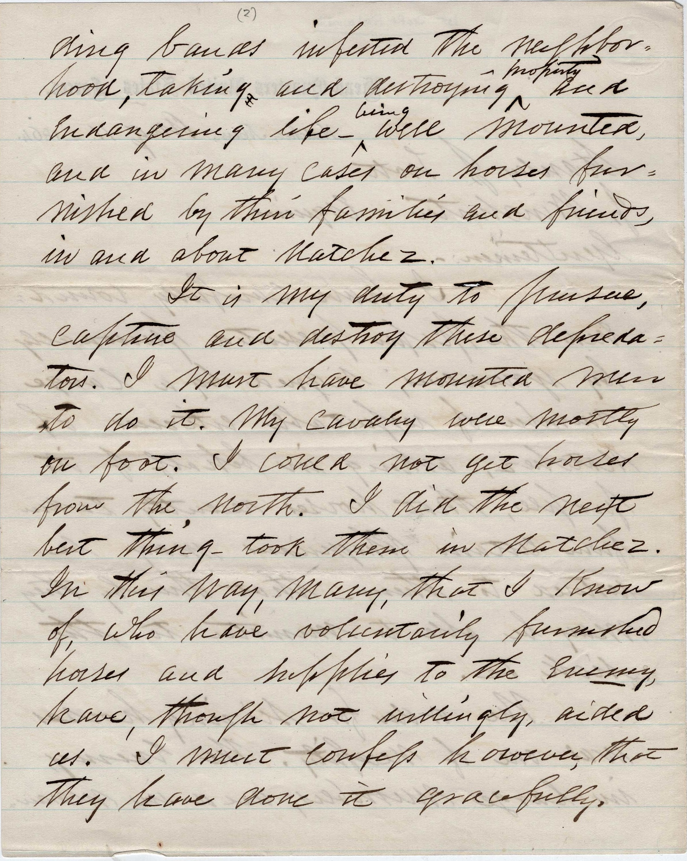 The order for seizing horses was one of necessity. The enemy in large numbers and in marauding bands infested the neighborhood, taking and destroying property and endangering life, being well mounted and in many cases on horses furnished by their families and friends in and about Natchez. It is my duty to pursue, capture, and destroy these depredators. I must have mounted men to do it. My cavalry were mostly on foot. I could not get horses from the North. I did the next best thing—took them in Natchez. In this way, many that I know of, who have voluntarily furnished horses and supplies to the enemy have, though not willingly, aided us. I must confess, however, that they have done it gracefully.