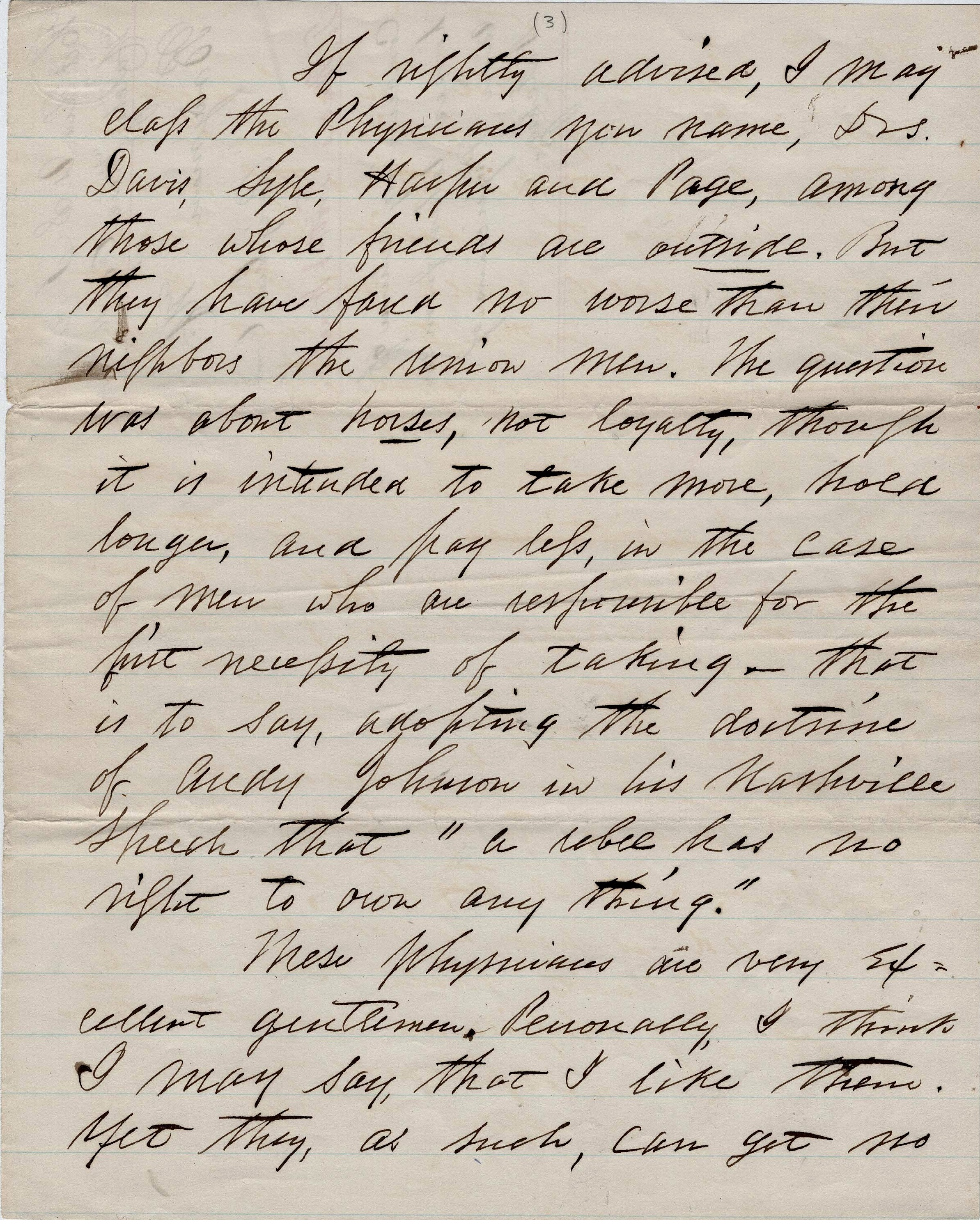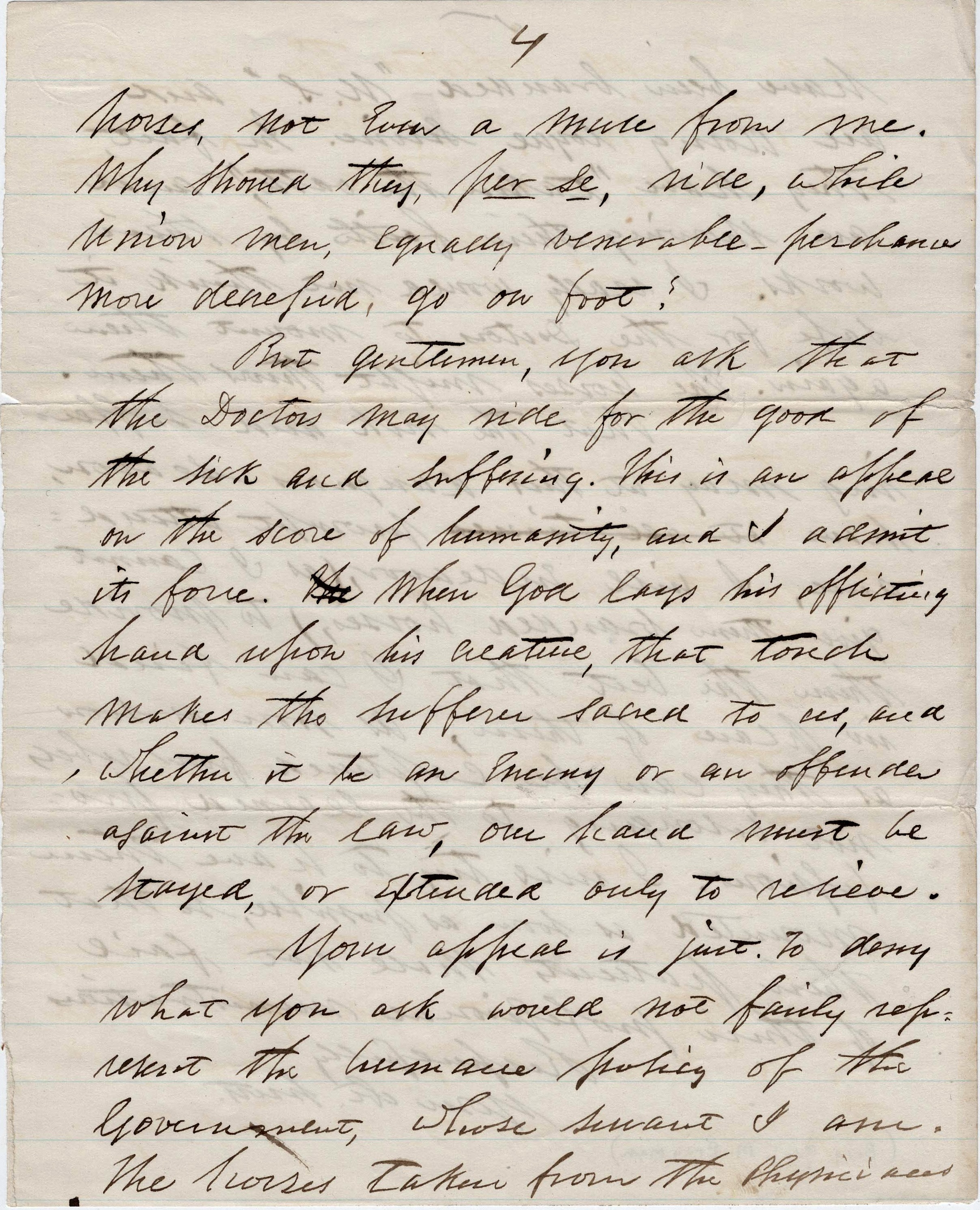 These physicians are very excellent gentlemen. Personally I think I may say that I like them. Yet they, as such, can get no horses, not even a mule from me. Why should they, per se, ride, while Union men, equally venerable—perchance more denefied [?], go on foot? But gentlemen, you ask that the doctors may ride for the good of the sick and suffering. This is an appeal on the score of humanity and I admit its force. When God lays his afflicting hand upon his creature, that touch makes the sufferer sacred to us, and, whether it be an enemy or an offender against the law, our hand must be stayed or extended only to relieve.