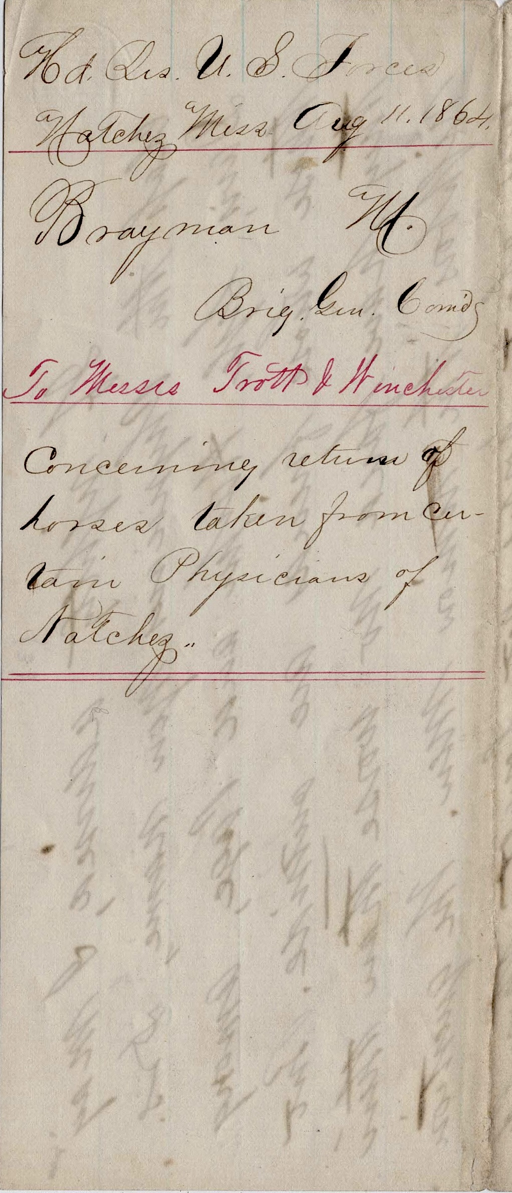 Brayman’s letter formally addresses a request from the citizens of Natchez for the return of horses that had been seized by his order to equip his cavalry in the pursuit of rebels and guerrillas within his District. He respectfully declines the request, citing military necessity as the rationale for commandeering the horses, while simultaneously expressing an understanding of the vital role that these animals play in supporting civilian physicians who care for the ill both in town and the surrounding areas. Brayman assures the citizens that he will facilitate the provision of horses liberated from the rebels as soon as it is feasible to do so.
